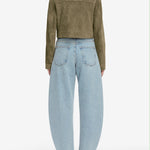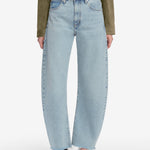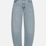 The best-selling Bubble, now with a shorter 27" inseam. The exaggerated take on the trending barrel silhouette is a unique fit and instant closet necessity. With a flattering high rise, these jeans have a curved outseam for a playful bubble effect. Note the light blue wash and raw, fringed hem for a pre-loved look.