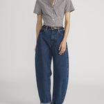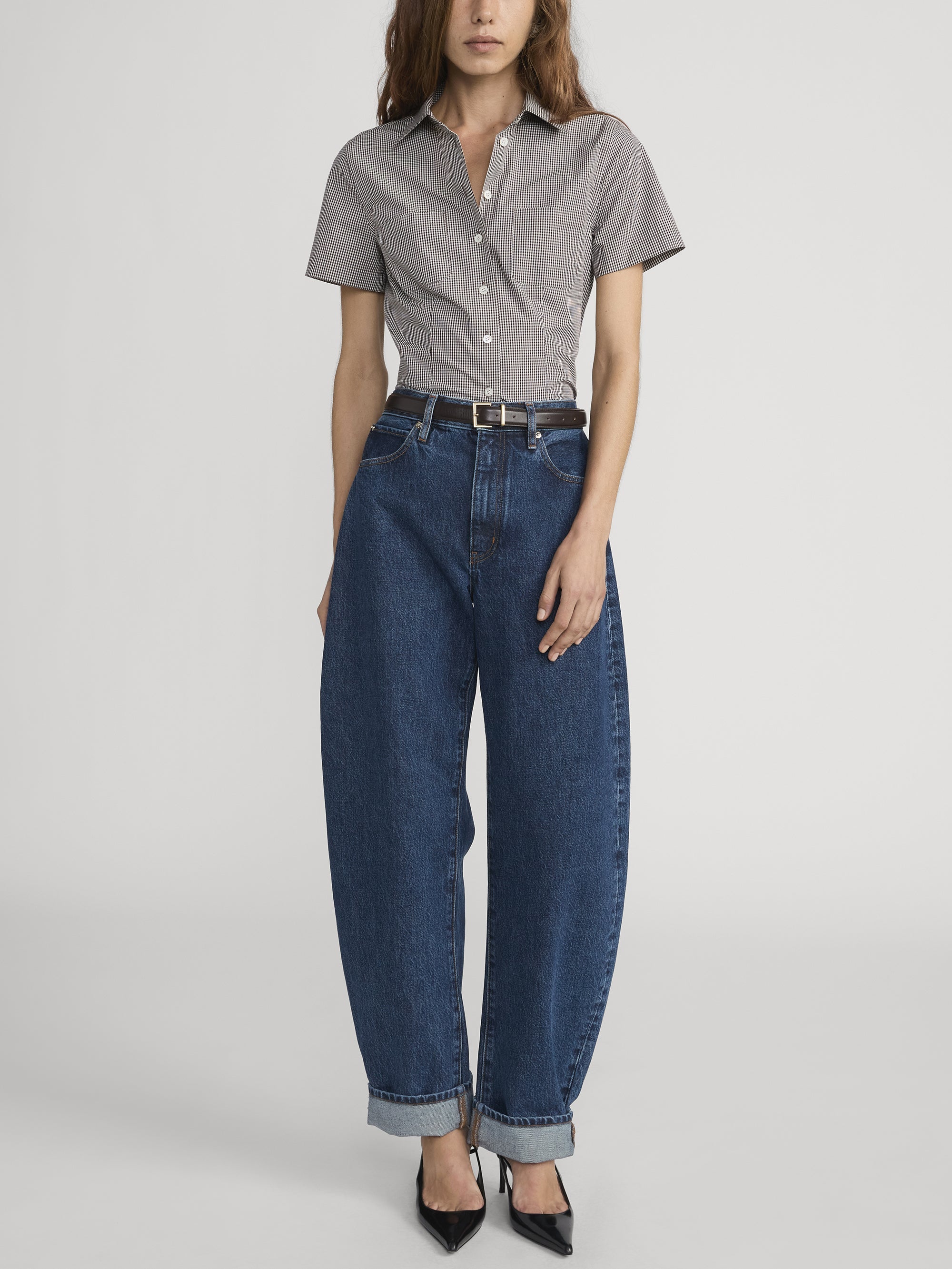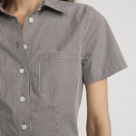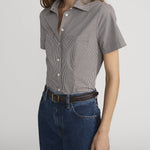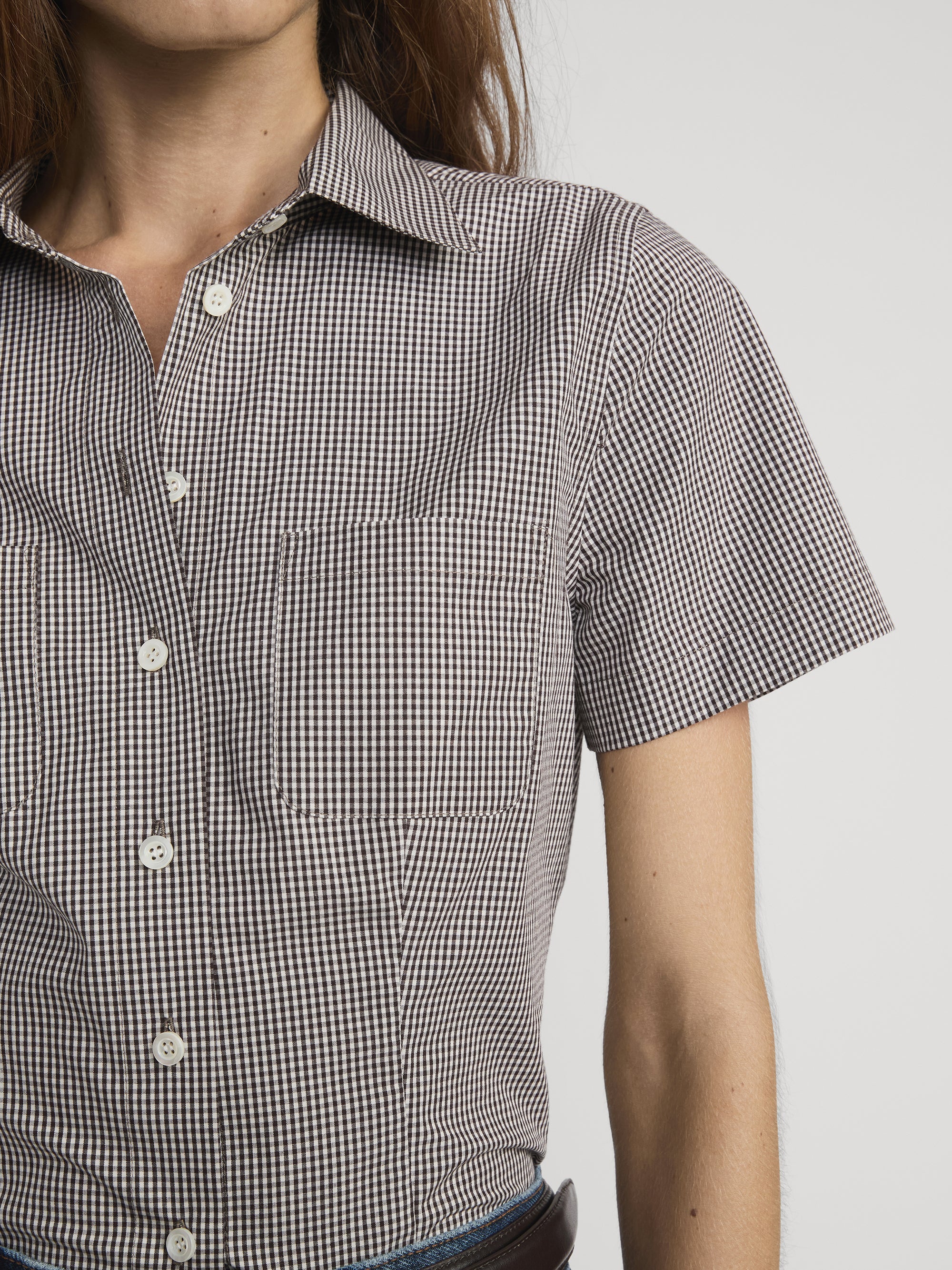 This poplin shirt bridges the seasons, with a Fall-ready brown colorway and a gingham print that nods to summer.  Transitional, polished and effortless, with dual front patch pockets and a pointed collar.