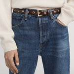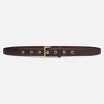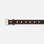 The classic leather belt, elevated—with a warm cabernet colorway and gold hardware and grommets. Sleek and polished with a touch of edge, this piece brings together any look.