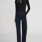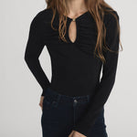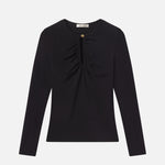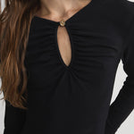 Sexy yet understated, this form-fitting top features a peek-a-boo keyhole with a gold knot button closure—the signature button featured throughout this collection. Crafted from jersey spandex.