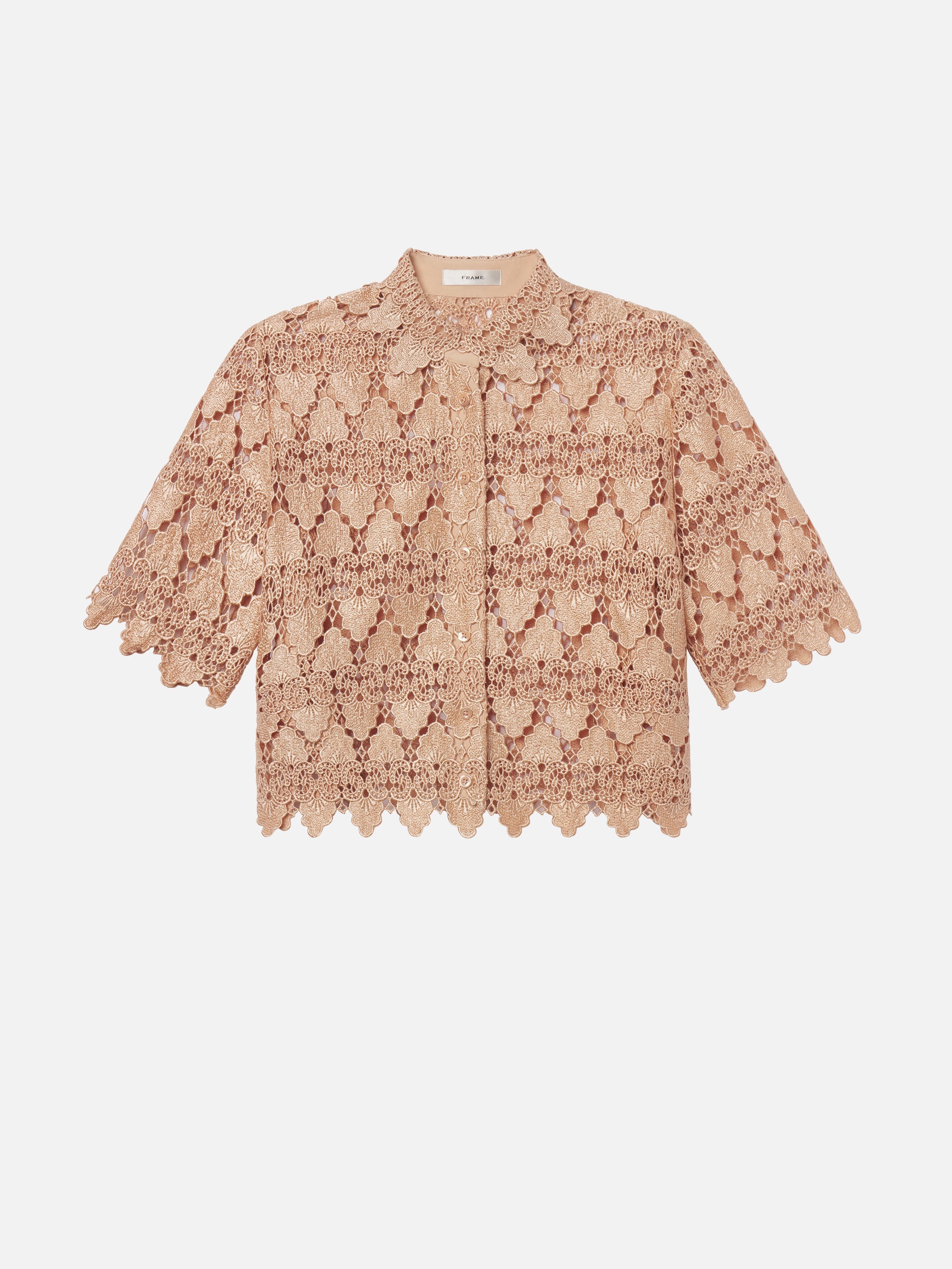 A feminine take on masculine shirting, this unlined button-down is crafted from a luxurious lace with a scallop-like finish along the hems. Featuring a slightly cropped, boxy fit, pair the Lace Button Up Shirt with oversized, destroyed denim to juxtapose the romantic nature of the blouse.