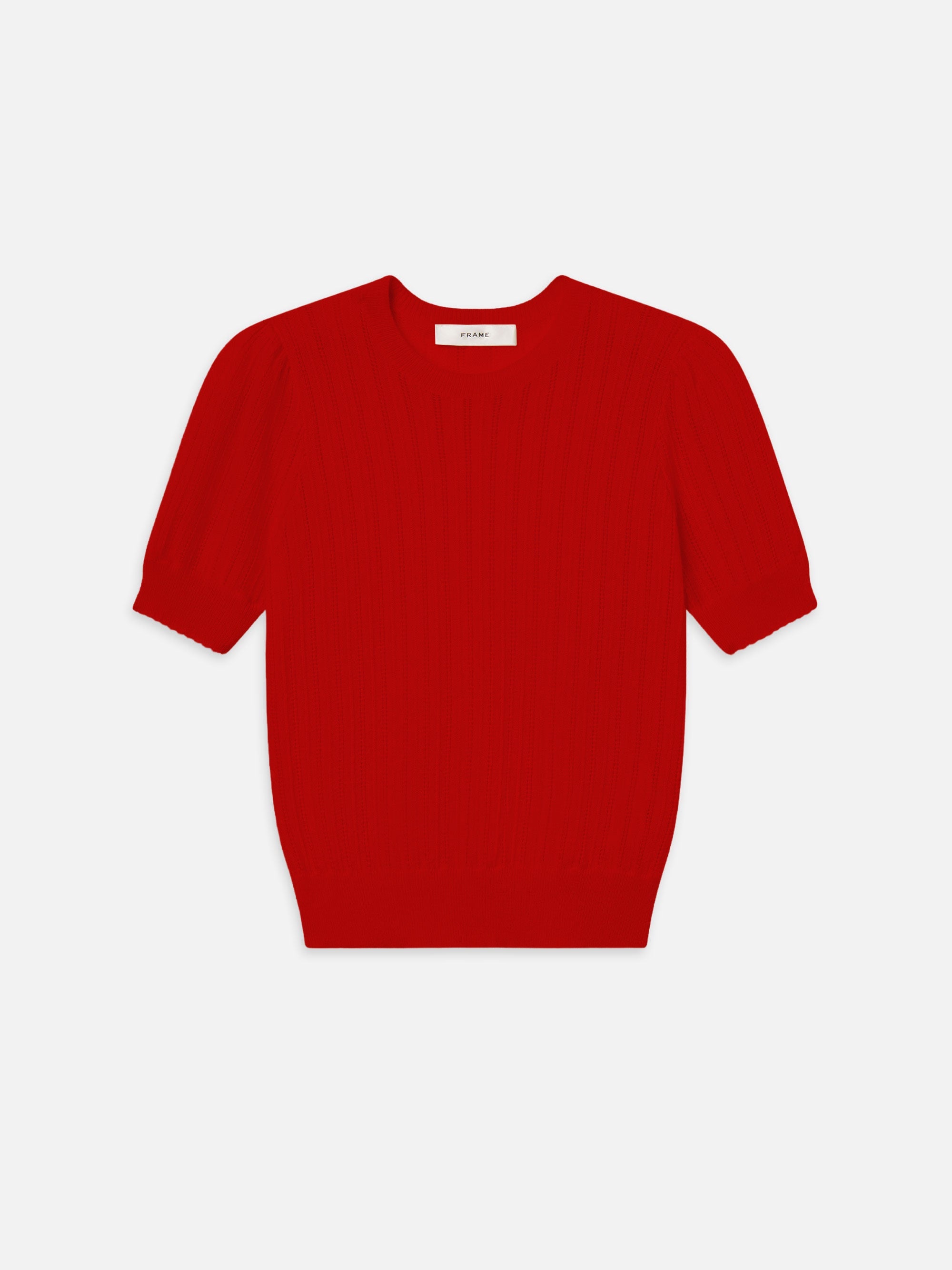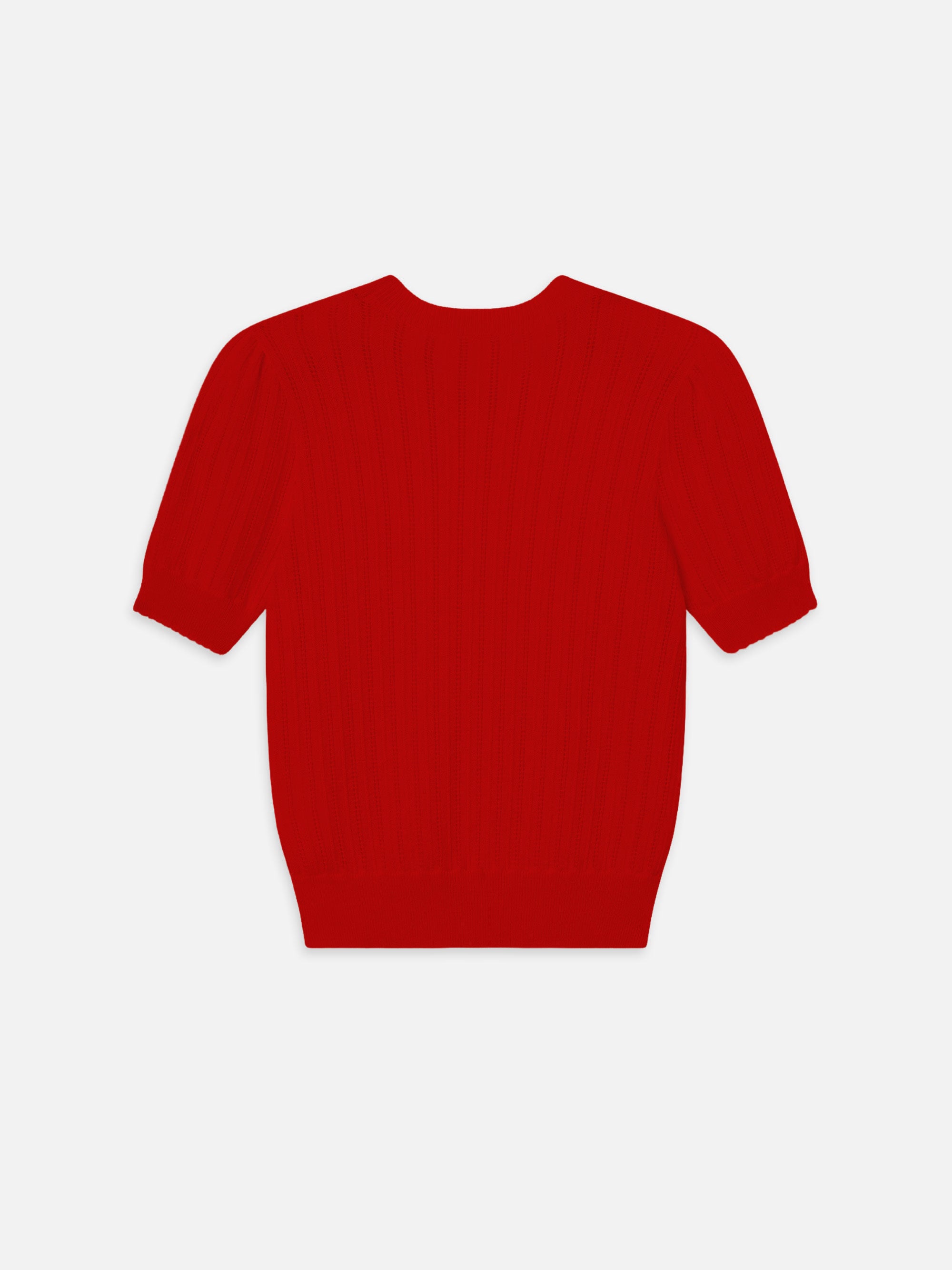 A lightweight cashmere knit with airy ladder pointelle stitching. With softly scalloped edges for an effortless, feminine feel.