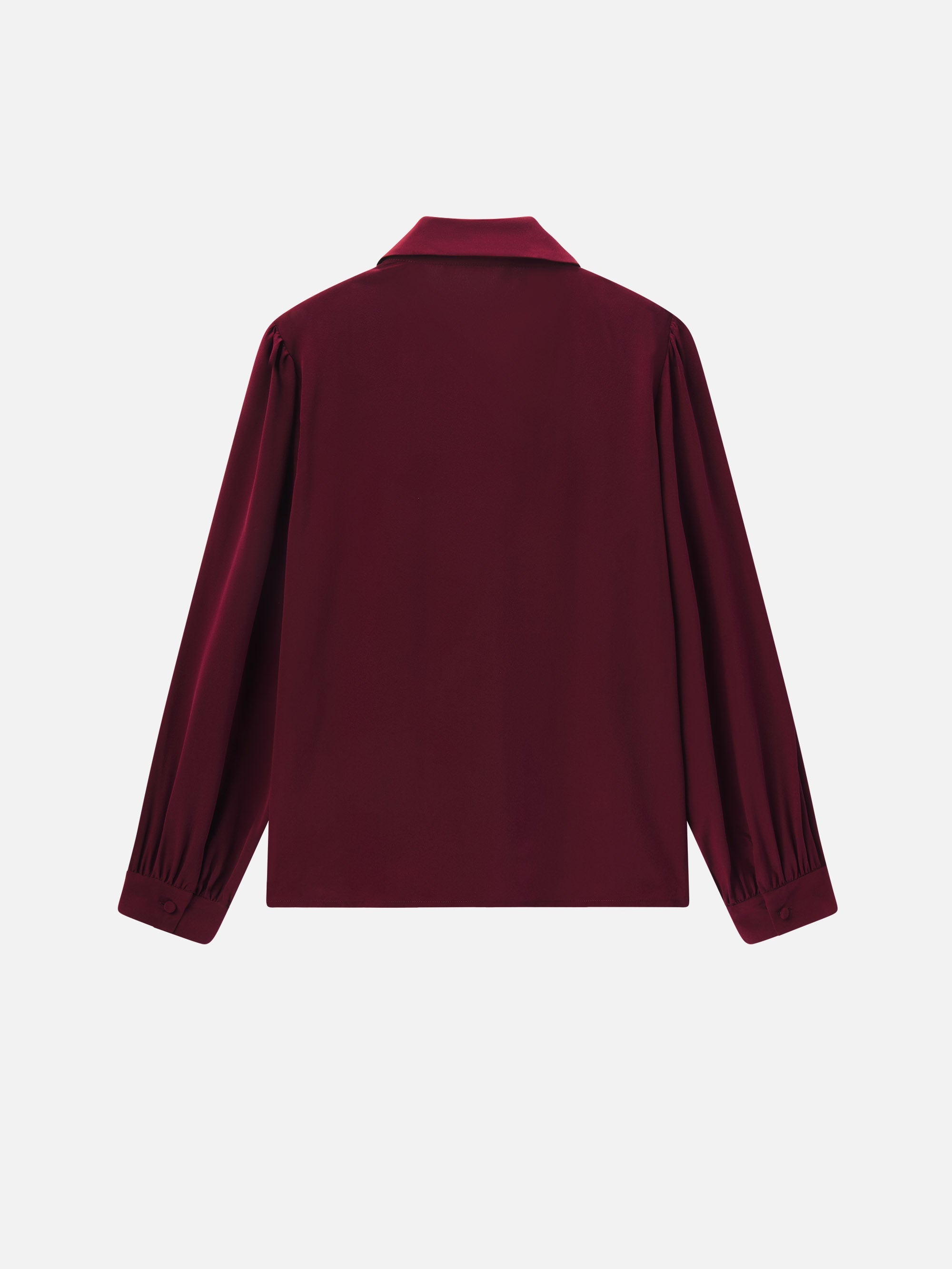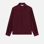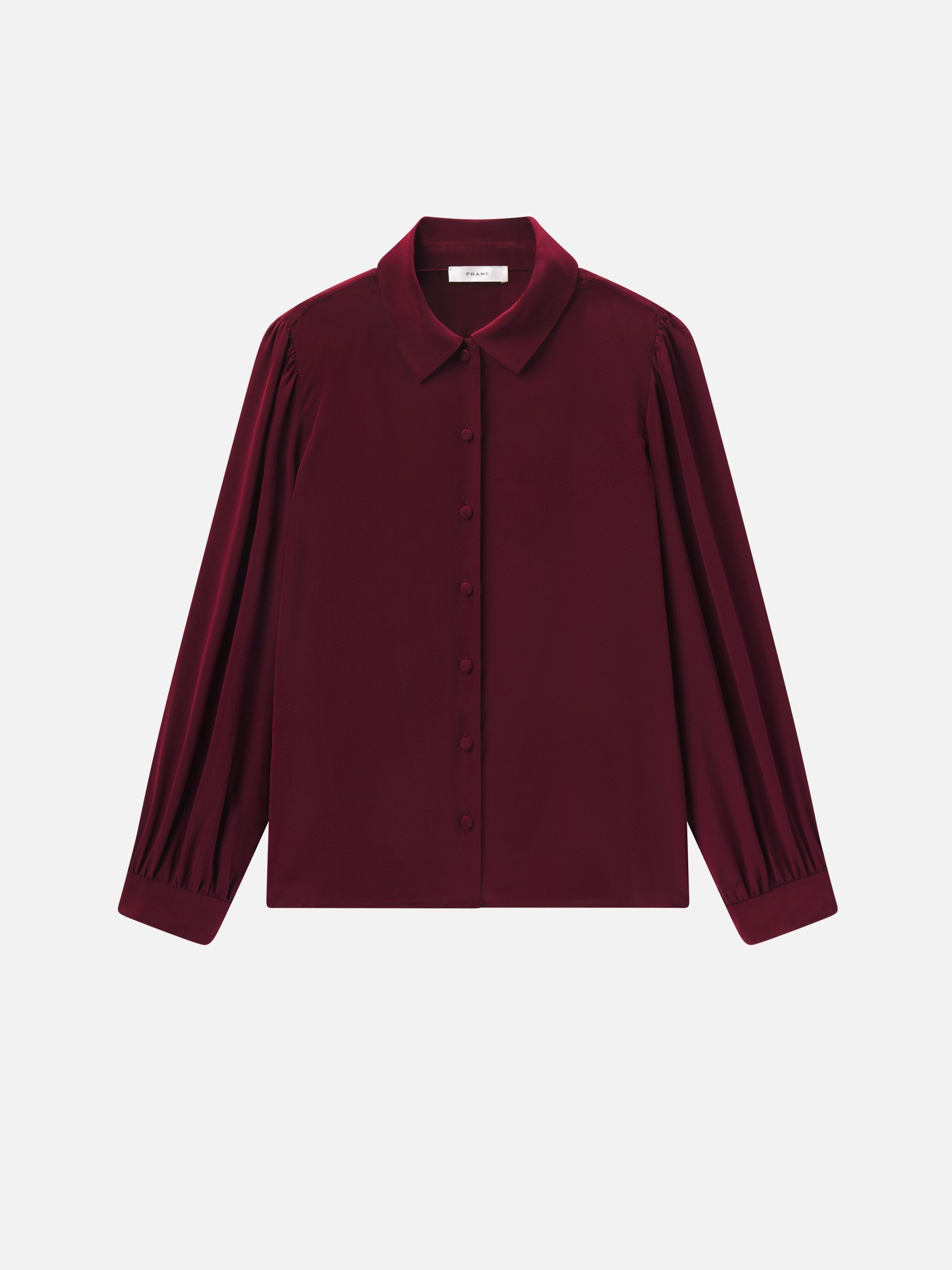 A core, must-have silhouette, this modern take on the traditional feminine collared shirt is crafted in pure silk with a rich pinot colorway. Gathered at the shoulder and cuff for subtle volume and finished with silk, self-covered buttons. A polished blouse that effortlessly elevates the seasonal uniform.