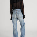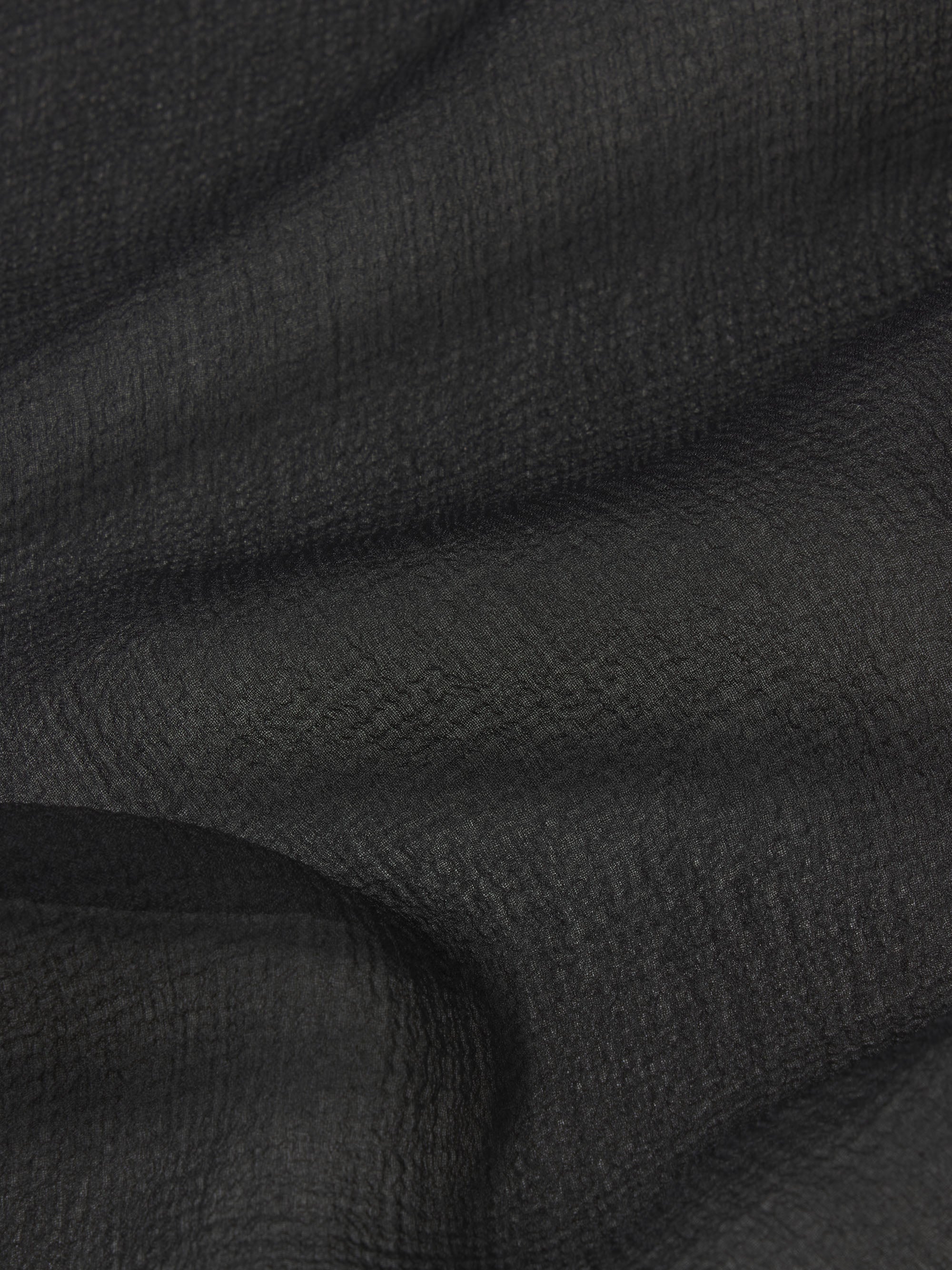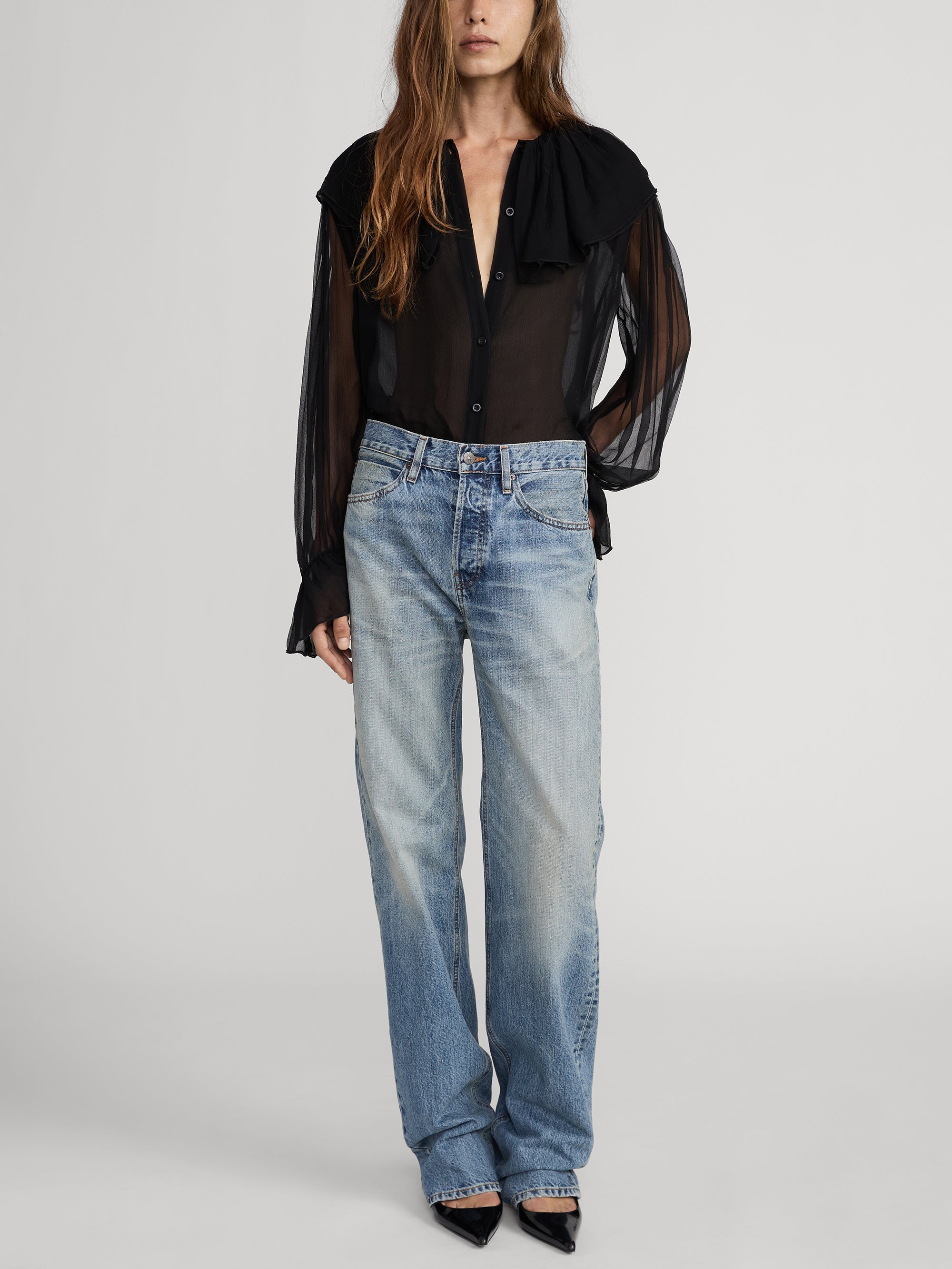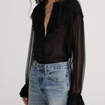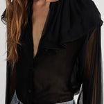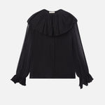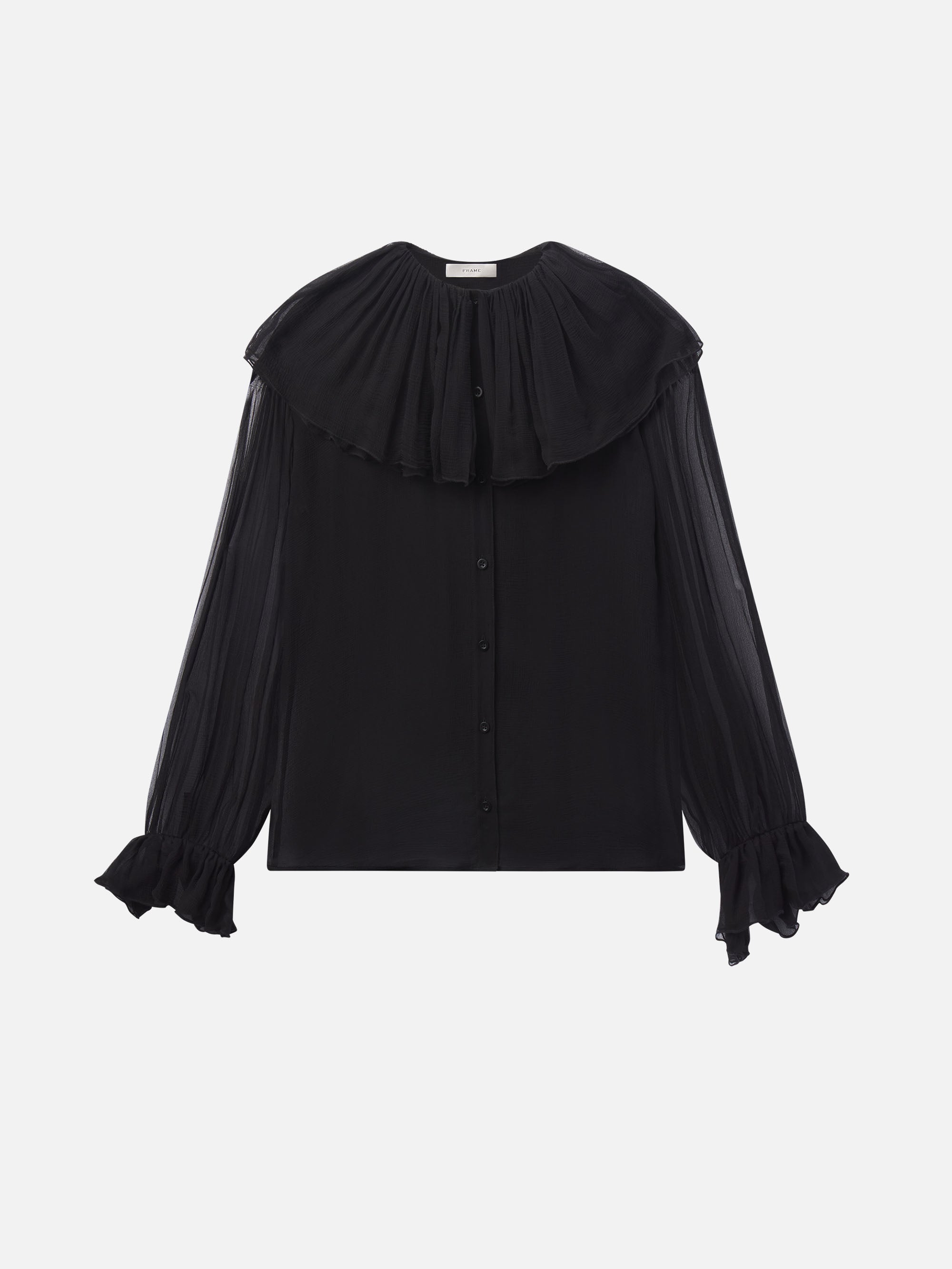 A standout from our new collection, crafted in pure black silk. This blouse features a voluminous tiered collar and vintage-inspired cuffs that gather and bell out. With sheer, single layer sleeves and a semi-sheer, double-layered body.