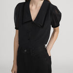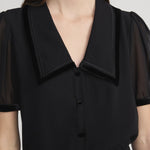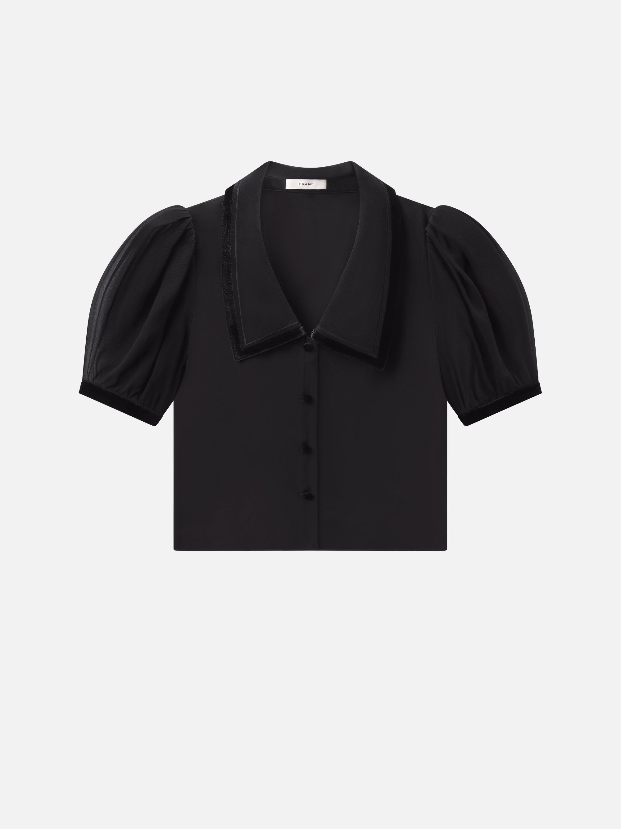 Our pure silk sailor blouse, elevated with velvet trim at the collar. A feminine silhouette with short, slightly puffed sleeves and an oversized collar.