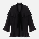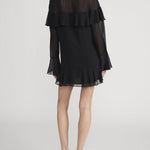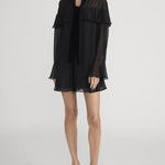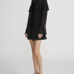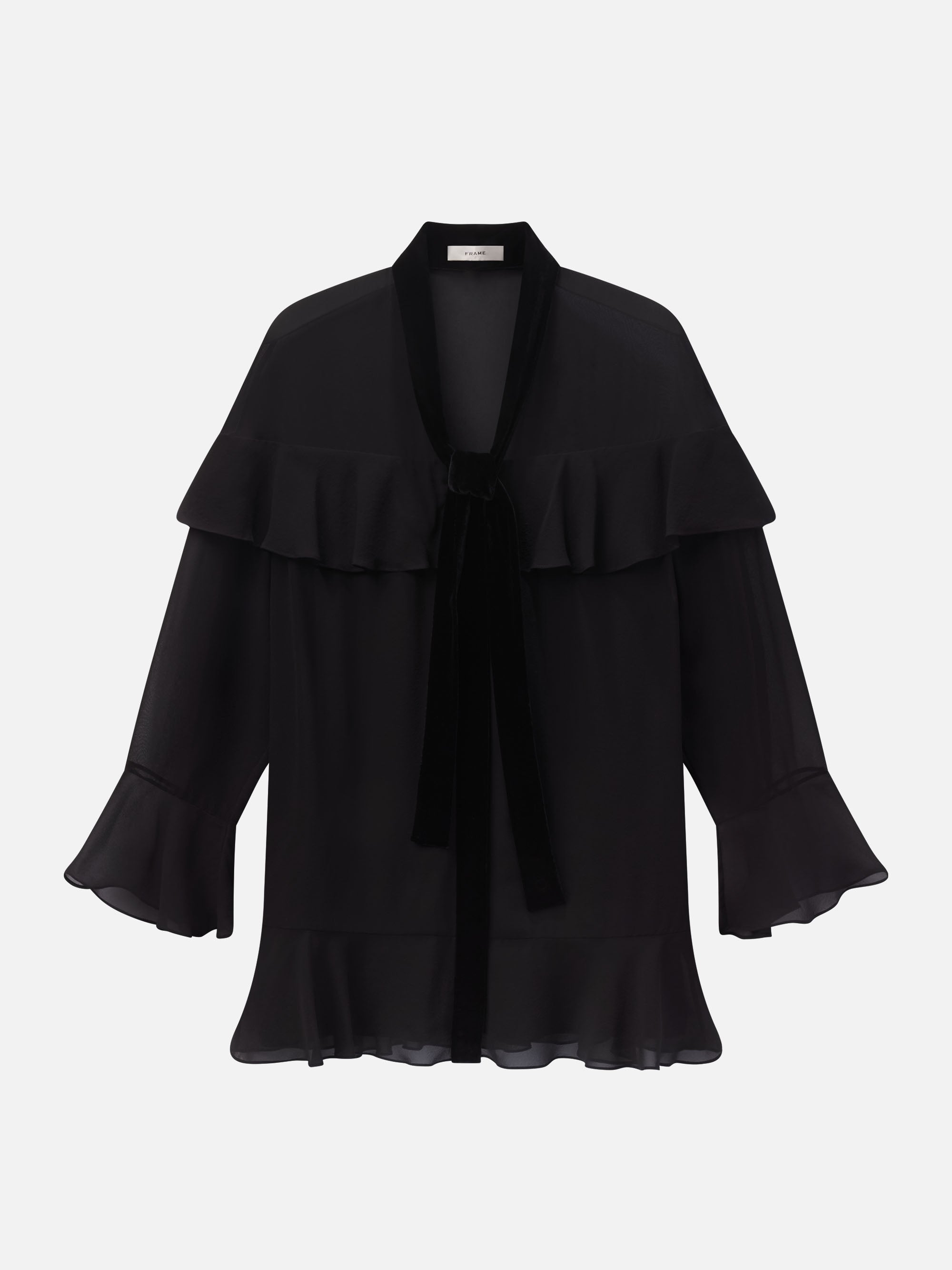 This silk minidress has a light and airy texture that moves with you. The attached velvet necktie adds a luxe seasonal detail. Fully lined, with delicate bell sleeves and ruffles.