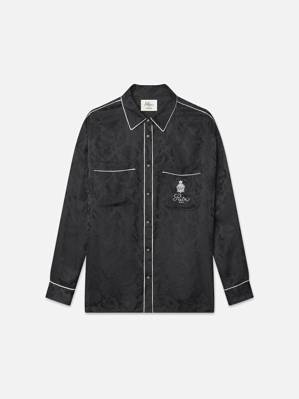 The pajama trend never left—and this shirt from FRAME x Ritz Paris is here to prove it. Crafted in sumptuous 100% silk, it features the Ritz's historic emblem embroidered at the pocket. Wear it with the coordinating pleated trouser for an elegant "just rolled out of bed at the Ritz" look.