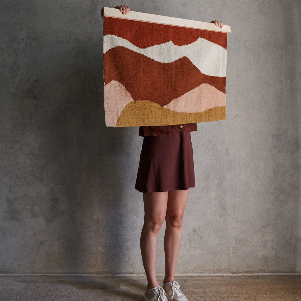 All the mountain views without the hike. A work of art inspired by a natural wonder, this wall hanging traces the peaks and valleys of the Sierra Madre Mountains near Oaxaca. Available in rust or olive, every piece is crafted with soft wool to create a masterpiece you can actually touch.