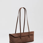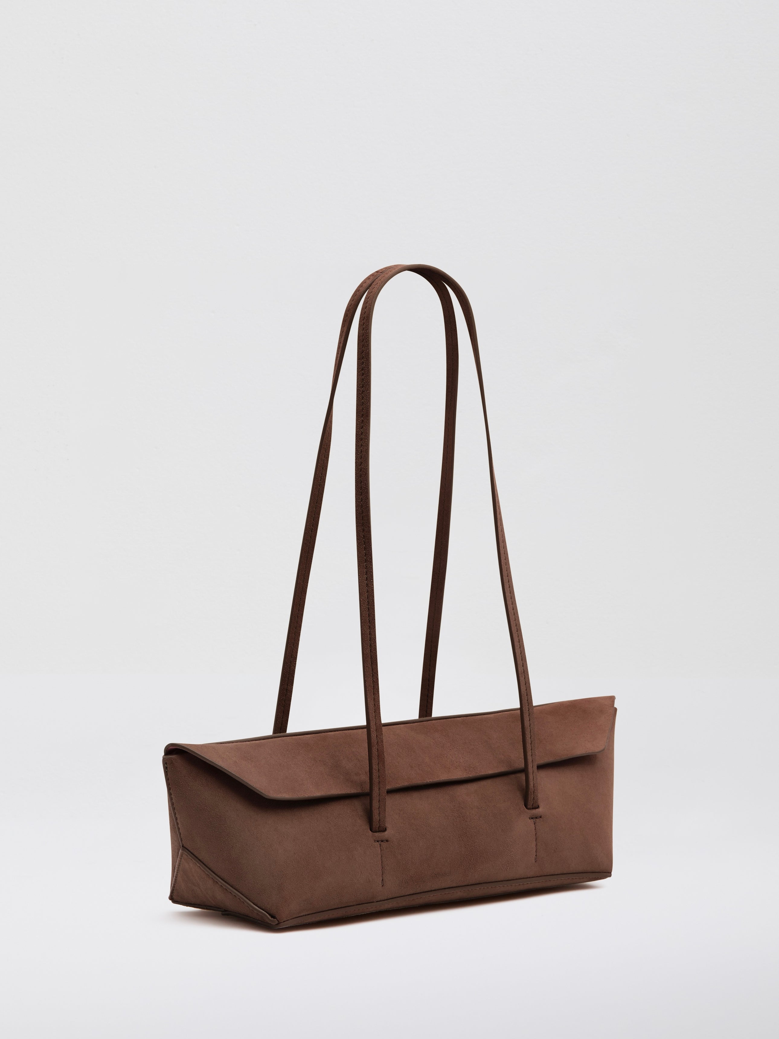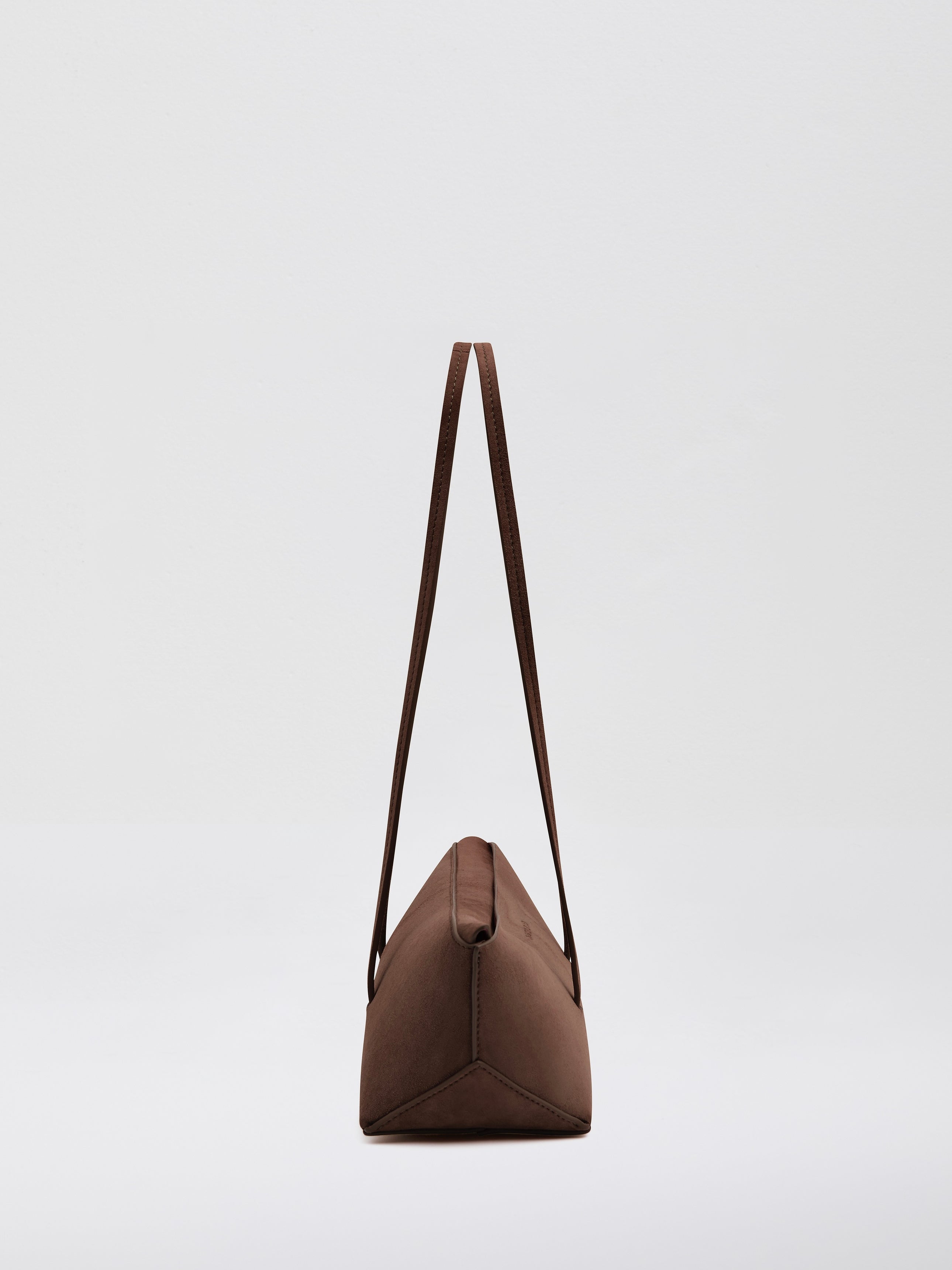 Form and function combines with this mini suede tote bag. Designed with sculptural folds and peaks, its minimal flap opening can be tucked in to reveal an embossed custom logo.