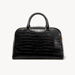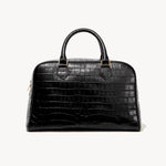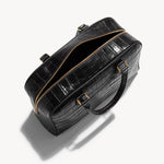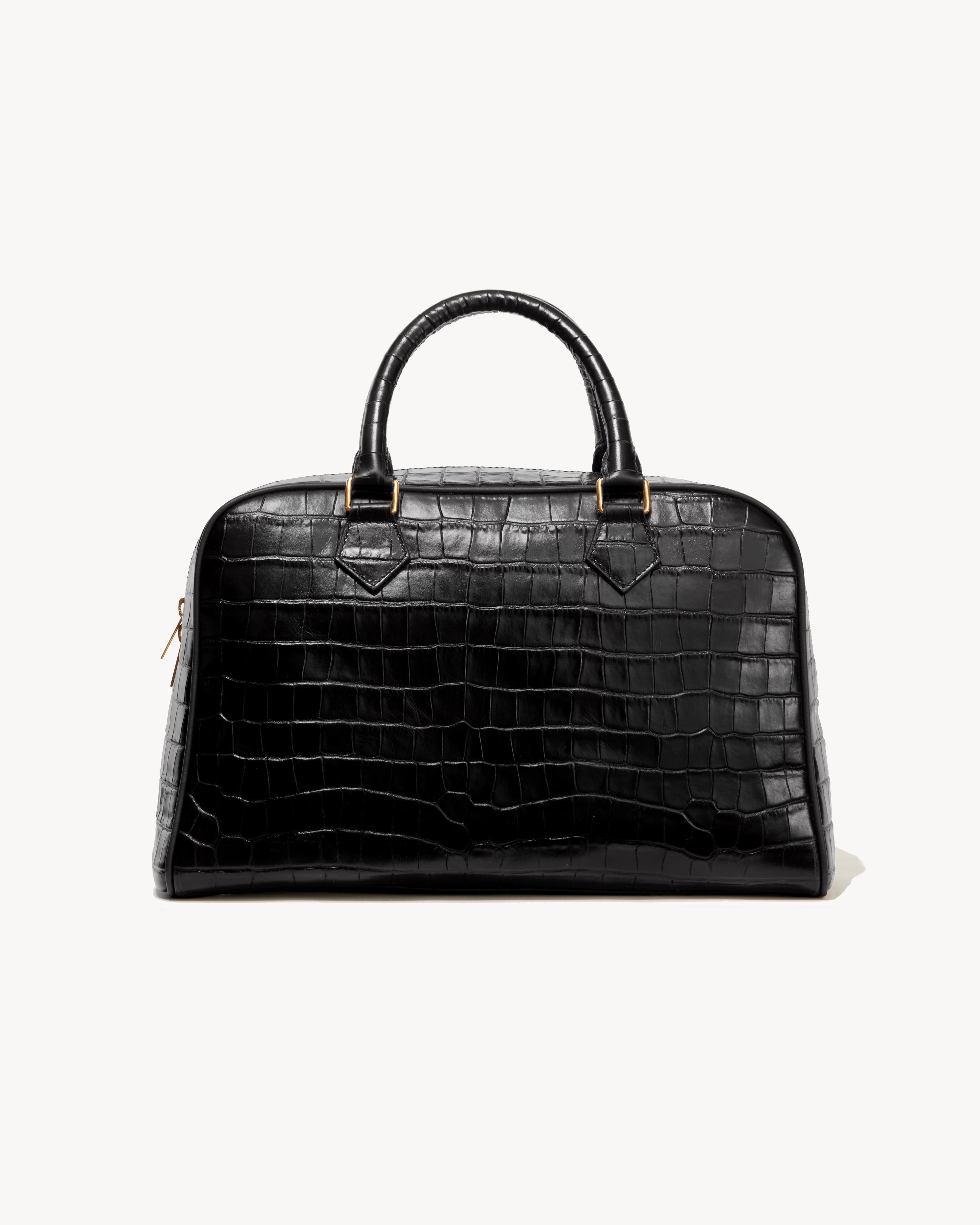 Top-handle bag in Italian embossed croc (stamped calfskin). Italian suede lining. Semi-structured silhouette with a soft handfeel that collapses intentionally over time. Structured base. Removable interior pouch. Interior back wall zip pocket. No exterior logo. Interior debossed NILI LOTAN NEW YORK logo. Logo zipper pullers at top closure. Back wall pocket. Logo rectangle rings at handles. D-ring and dog clip closure at interior. Metal feet at base of bag.