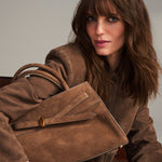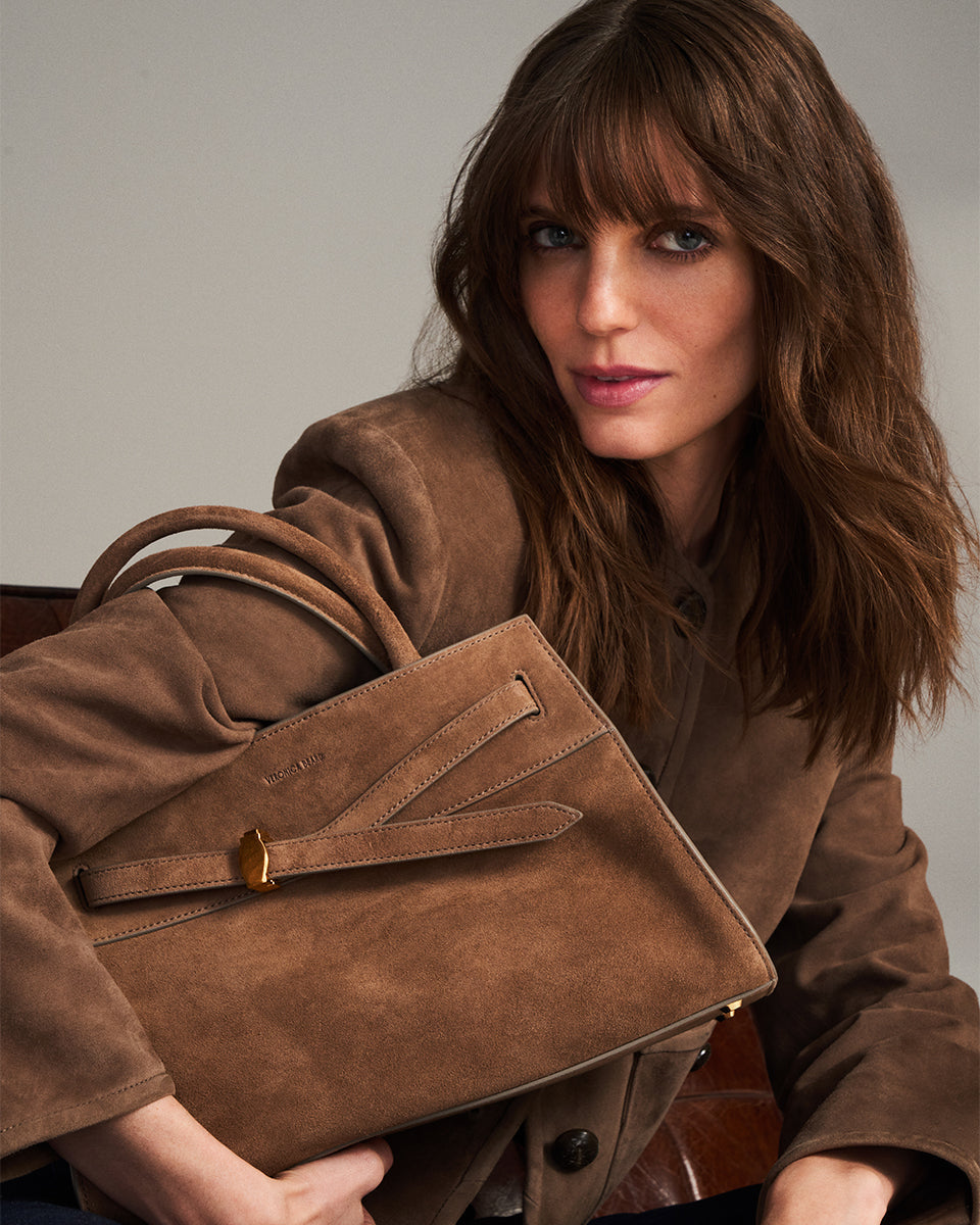 The aptly named Dash is a go-anywhere bag that takes you from work to weekends. Crafted from soft Italian suede with an adjustable belted strap, it’s designed with both a structured top handle and a removable shoulder strap for maximum versatility.