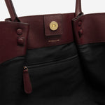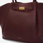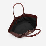 Exterior: Double top handles, metal feet, unique triangular fold design, foil embossed DeMellier logo.