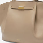 Exterior: Double top handles, metal feet, unique triangular fold design, foil embossed DeMellier logo.