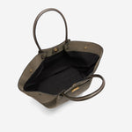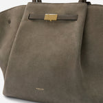 Exterior: Double top handles, metal feet, unique triangular fold design, foil embossed DeMellier logo.