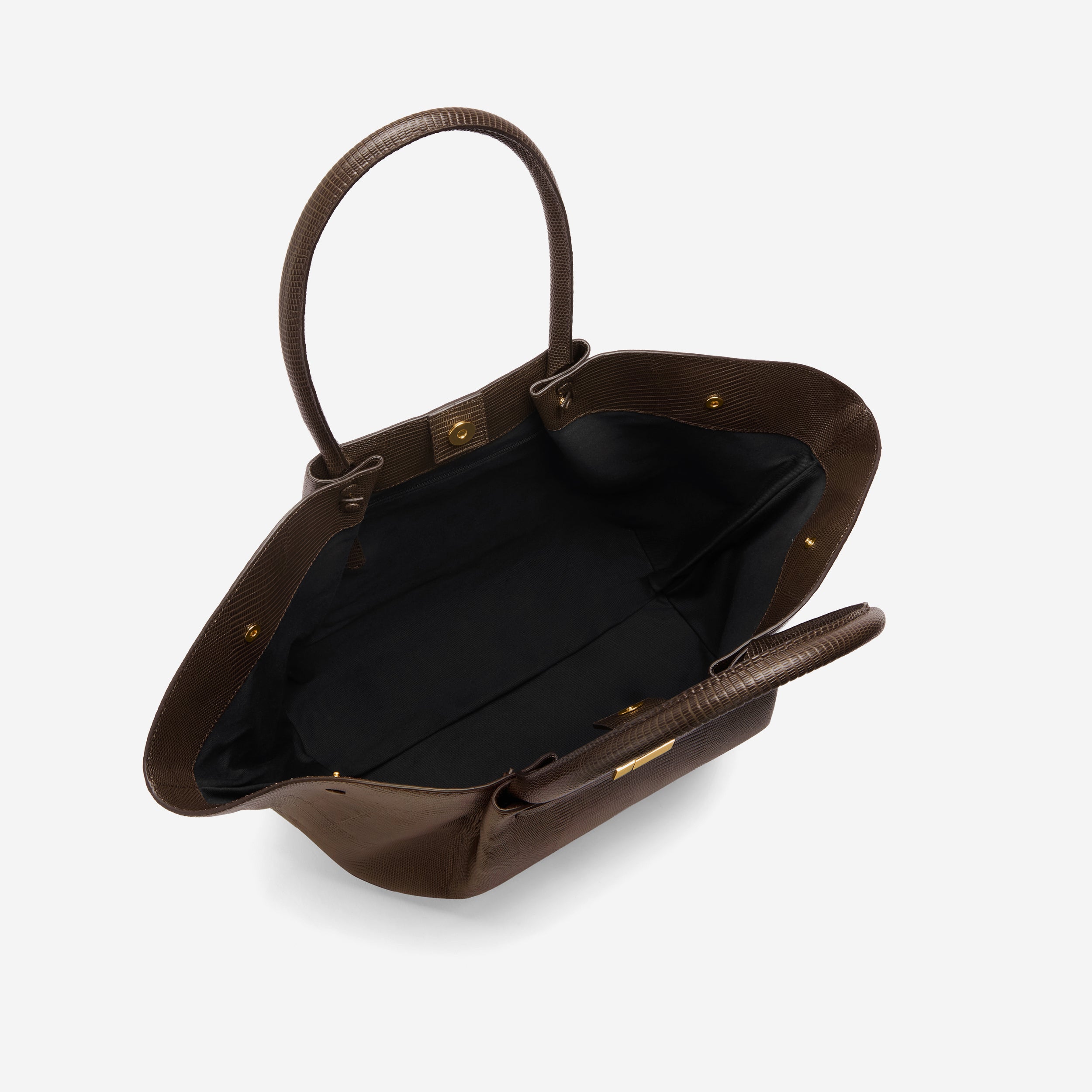 Exterior: Double top handles, metal feet, unique triangular fold design, foil embossed DeMellier logo.