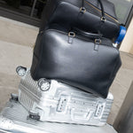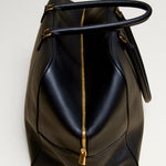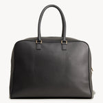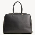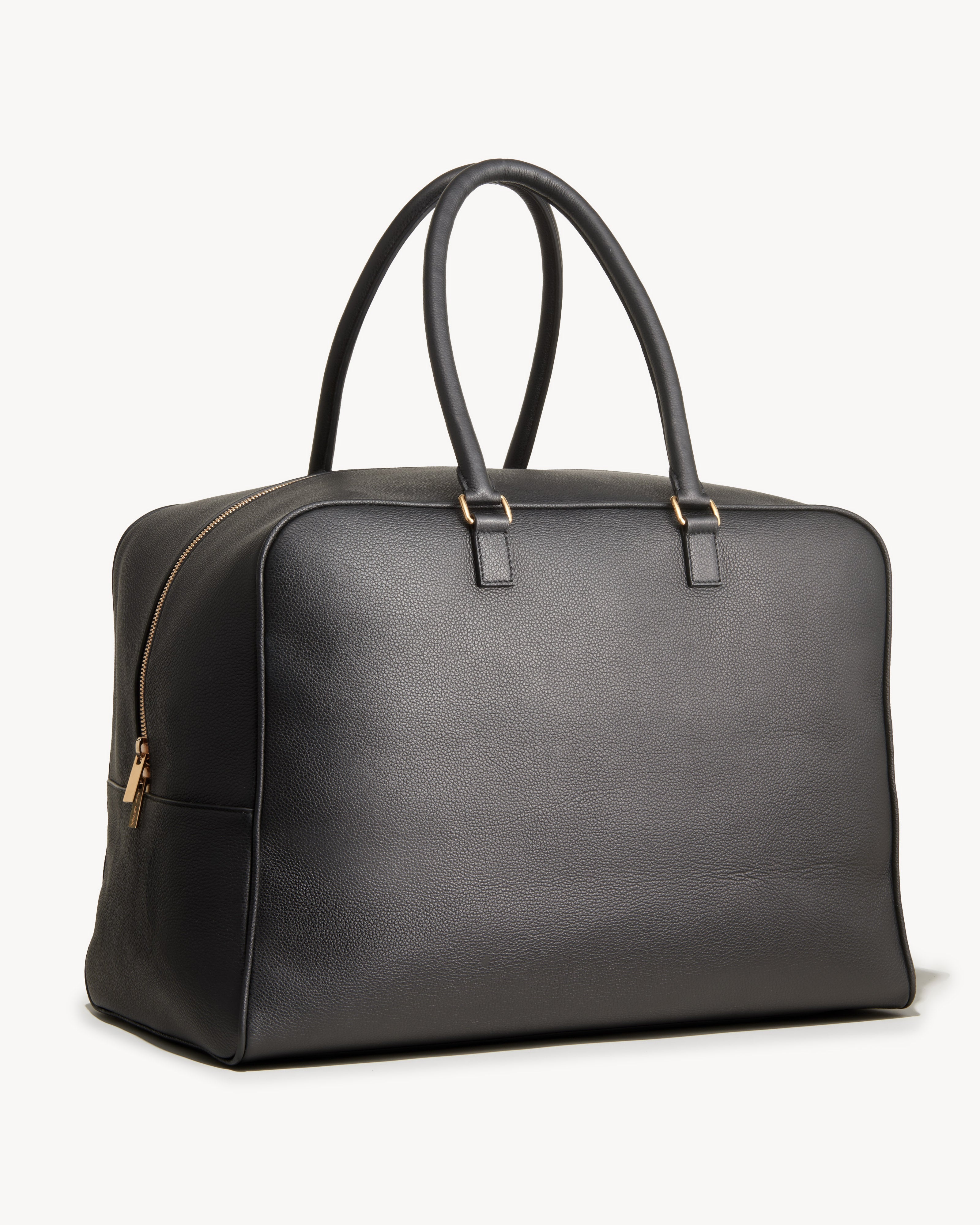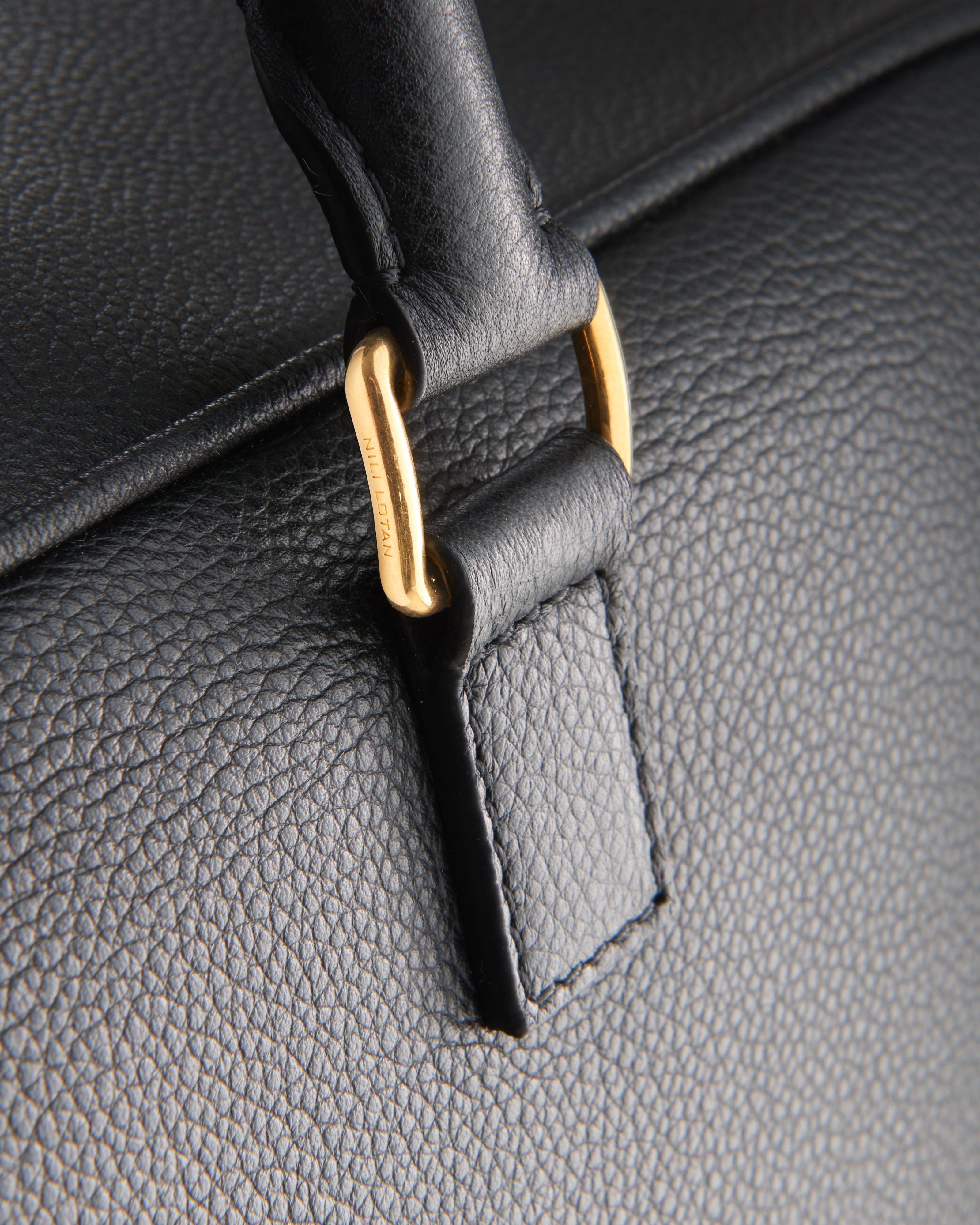 Structured large top handle shoulder bag in Italian grain leather. Removable interior pouch. Interior zipper pocket. Interior debossed logo. Lining in Italian suede.