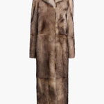 A high-necked jacket in silky-soft, hand-tip-dyed Toscana shearling. With peak lapels, high welt pockets, hook-and-eye closure, and internal buttons.