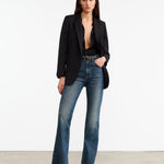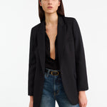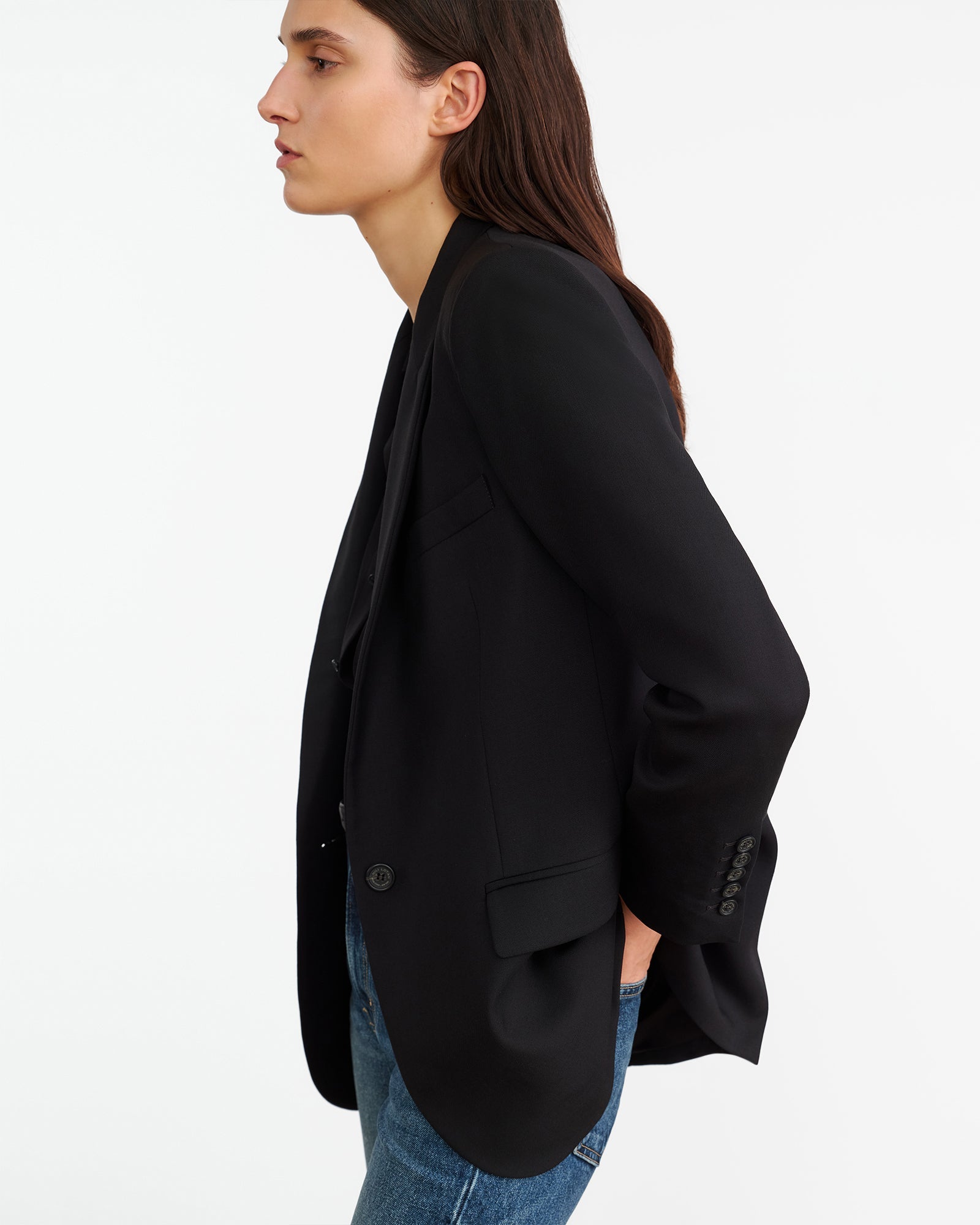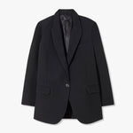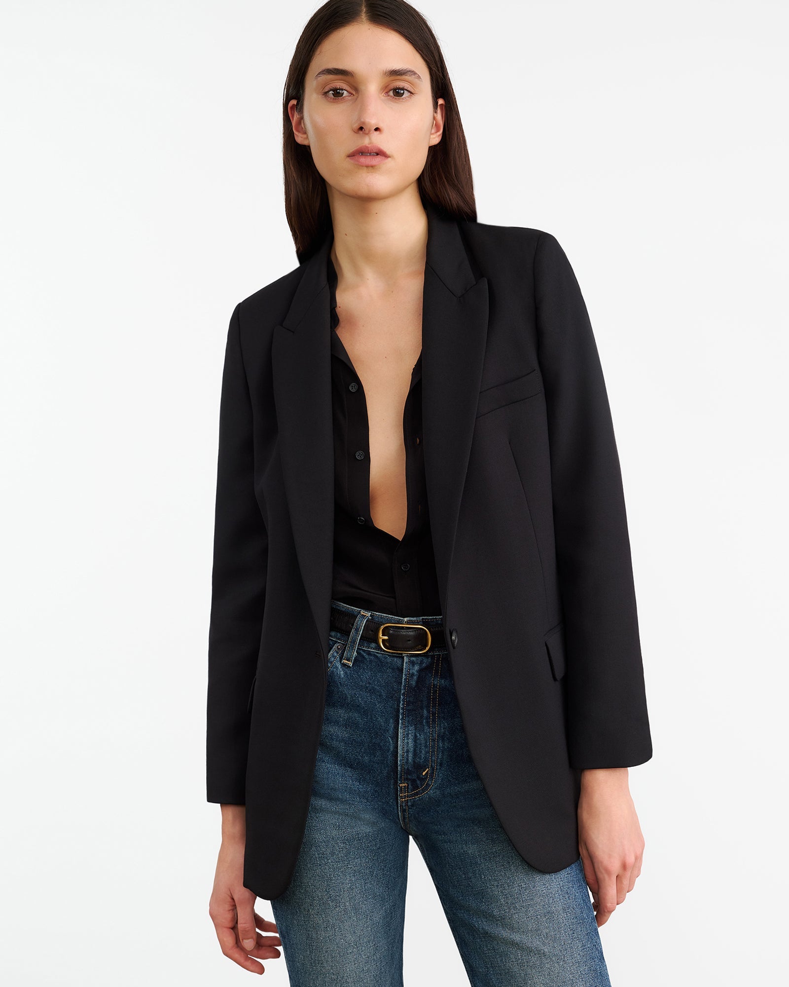 Slightly oversized classic constructed blazer in stretch wool twill. Flap pockets. Chest welt pocket. Interior pocket. Logo horn buttons. Front button closure. Cuff buttons.