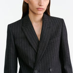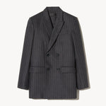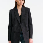 Double-breasted blazer. Long, slim body. Shoulder pads and dart detail at front for shape. Chest pocket and functional flap pockets. Button detail at lapel. Horn buttons at front and cuffs. Double back vent. Fully lined.
