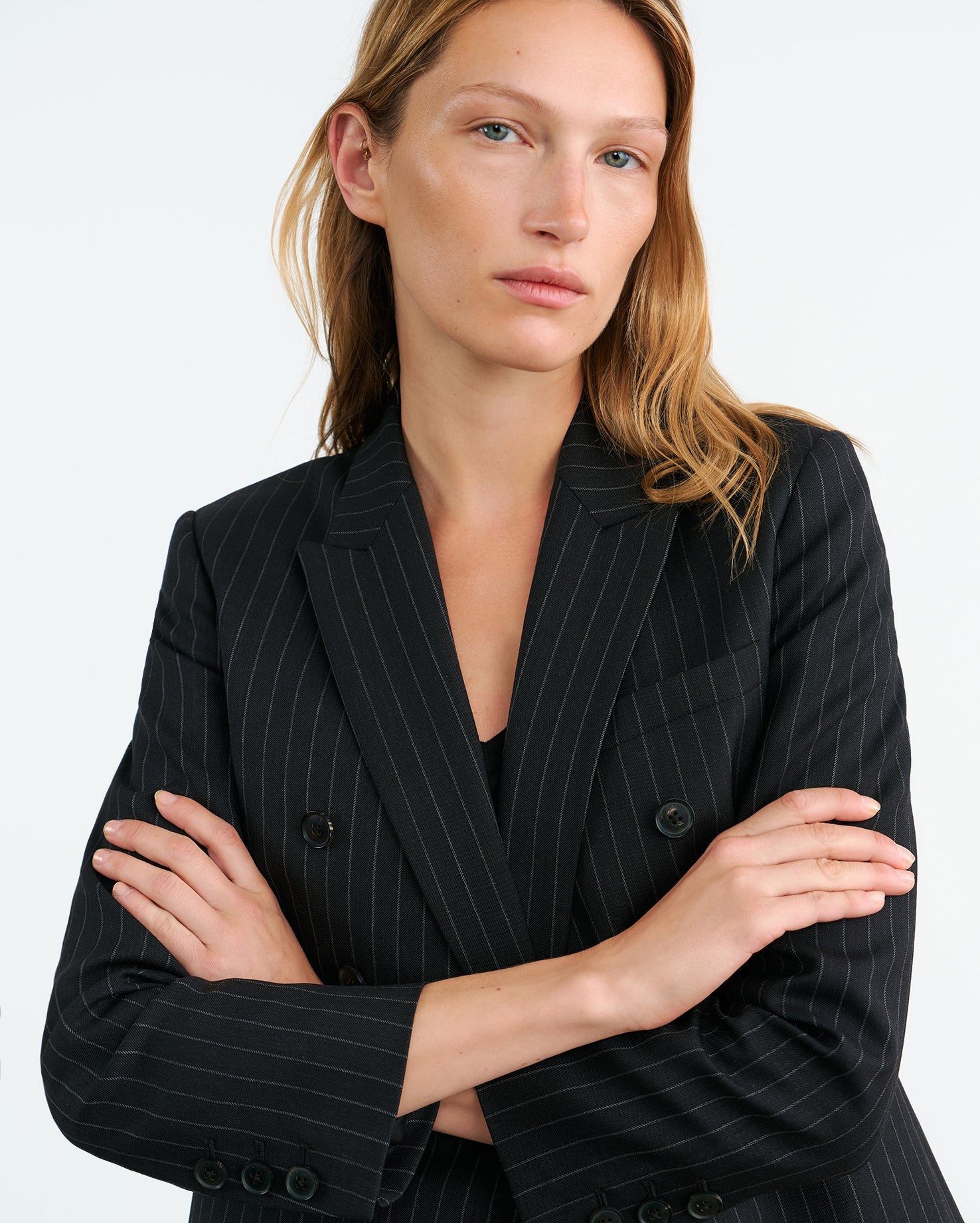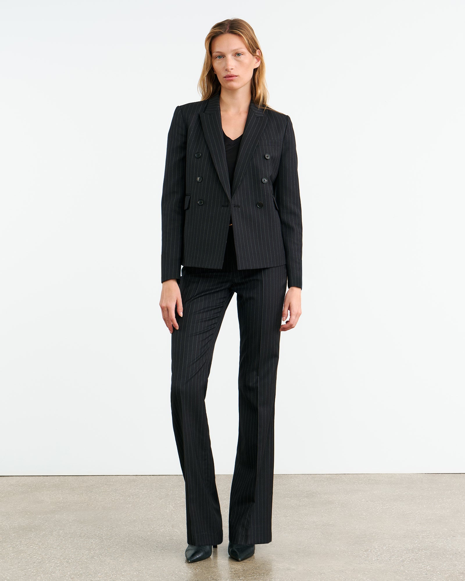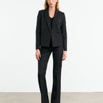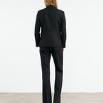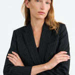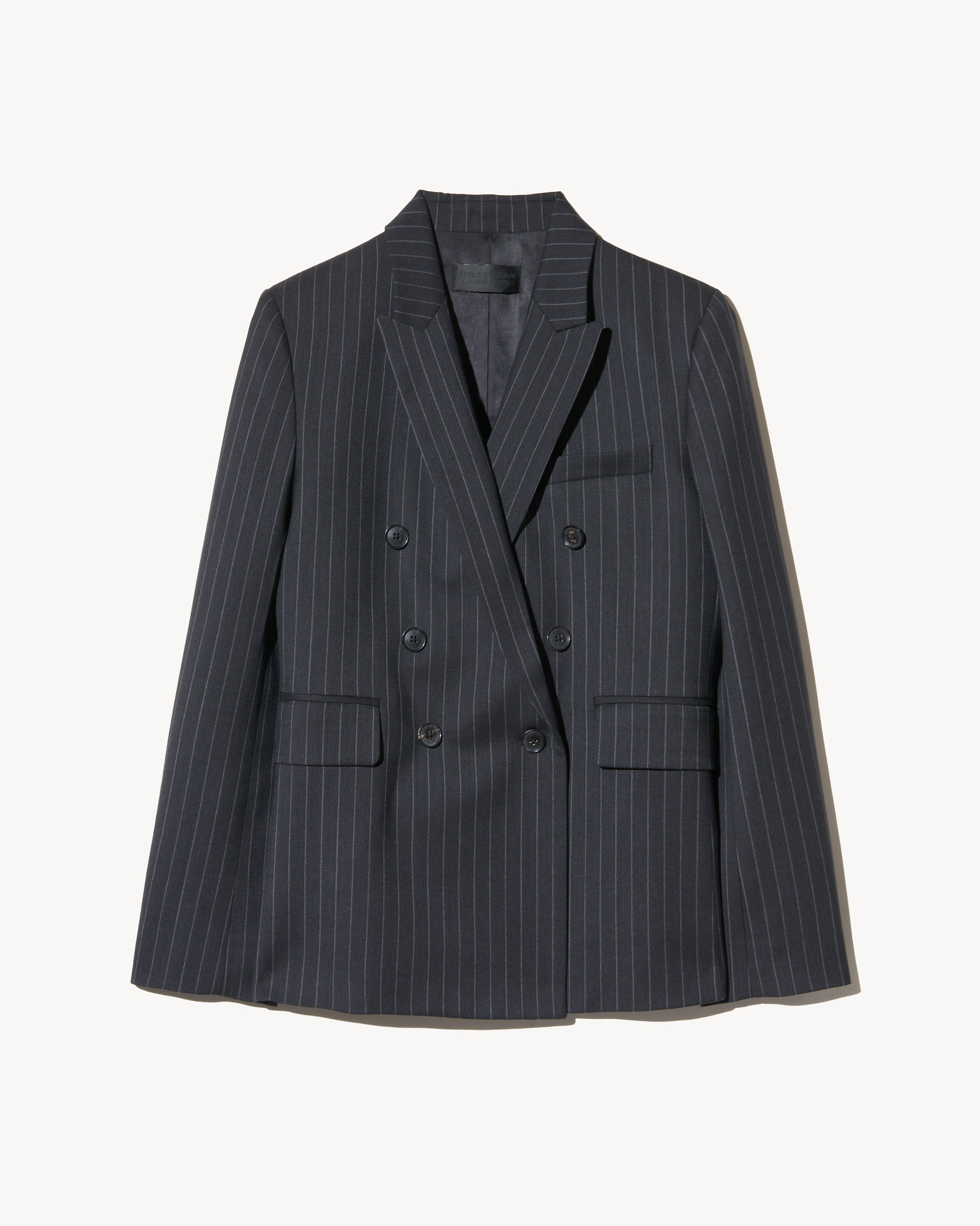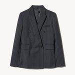 Shrunken, boxy fit double breasted jacket. Soft shoulder pads and structured sleeve heads. Chest welt pocket. Flap pockets. Back vent. Fully lined.