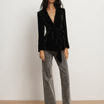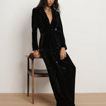 An elevated twist on the classic blazer. Crafted from luxurious black velvet, the Issel jacket features a relaxed, elongated silhouette and a wrap-style tie to cinch and define the waist. A peak lapel, chest welt pocket, and self-covered buttons at the front and sleeves enhance its clean, streamlined appeal. Perfect for event dressing, it pairs with the coordinating Alex pants for a chic tailored set.