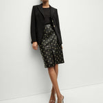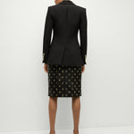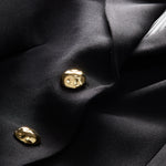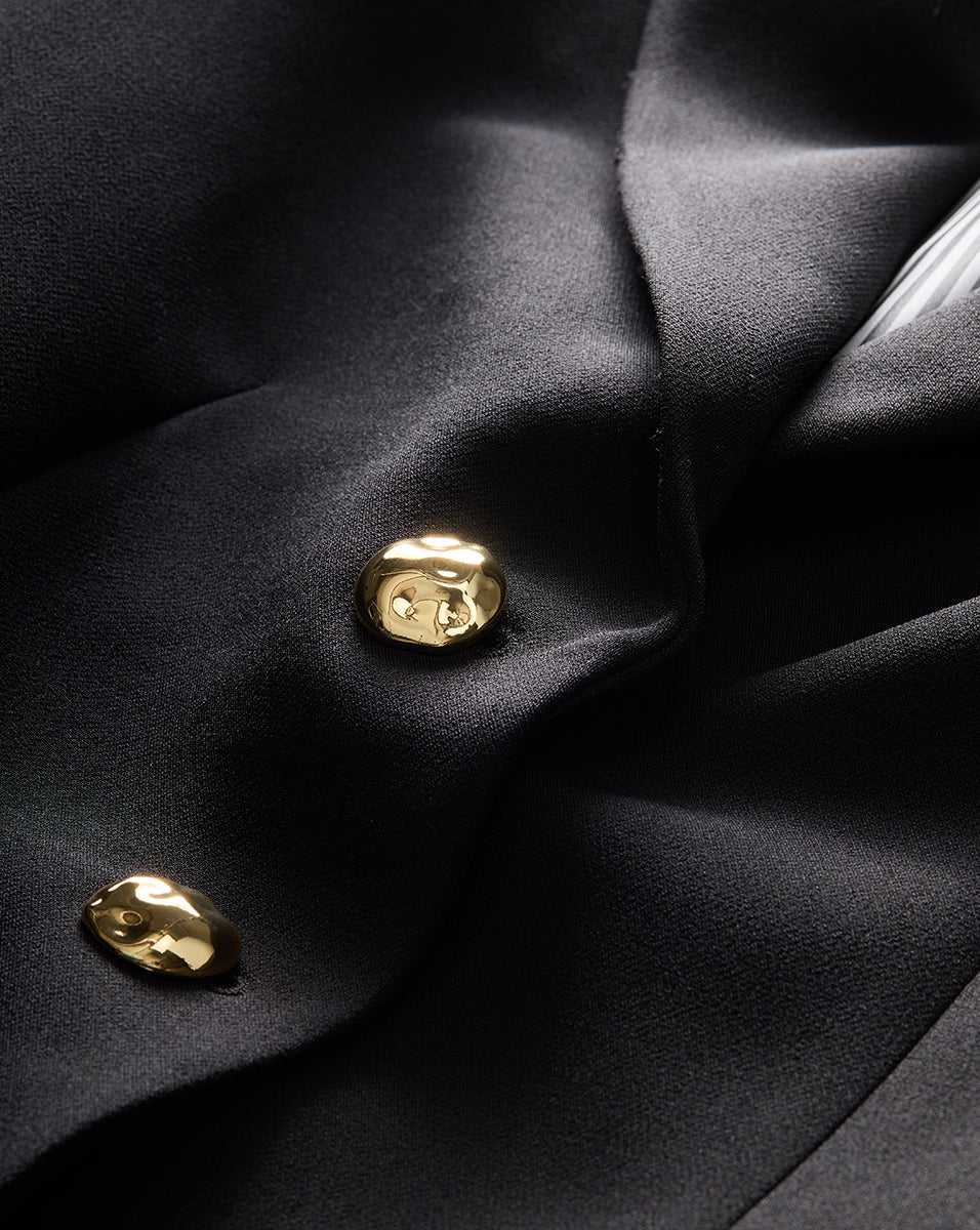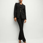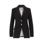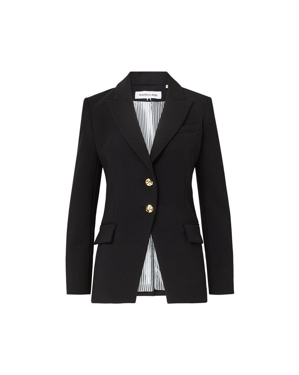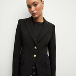 Expertly tailored in the US from a premium stretch blend, the Izara black blazer features a slim, single-breasted silhouette with gold buttons. Darts along the front further the waist-defining effect of this tailored blazer. Pair with a black pant for a power suit or layer over jeans and a tee to elevate the everyday.
