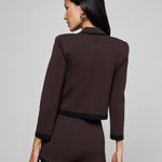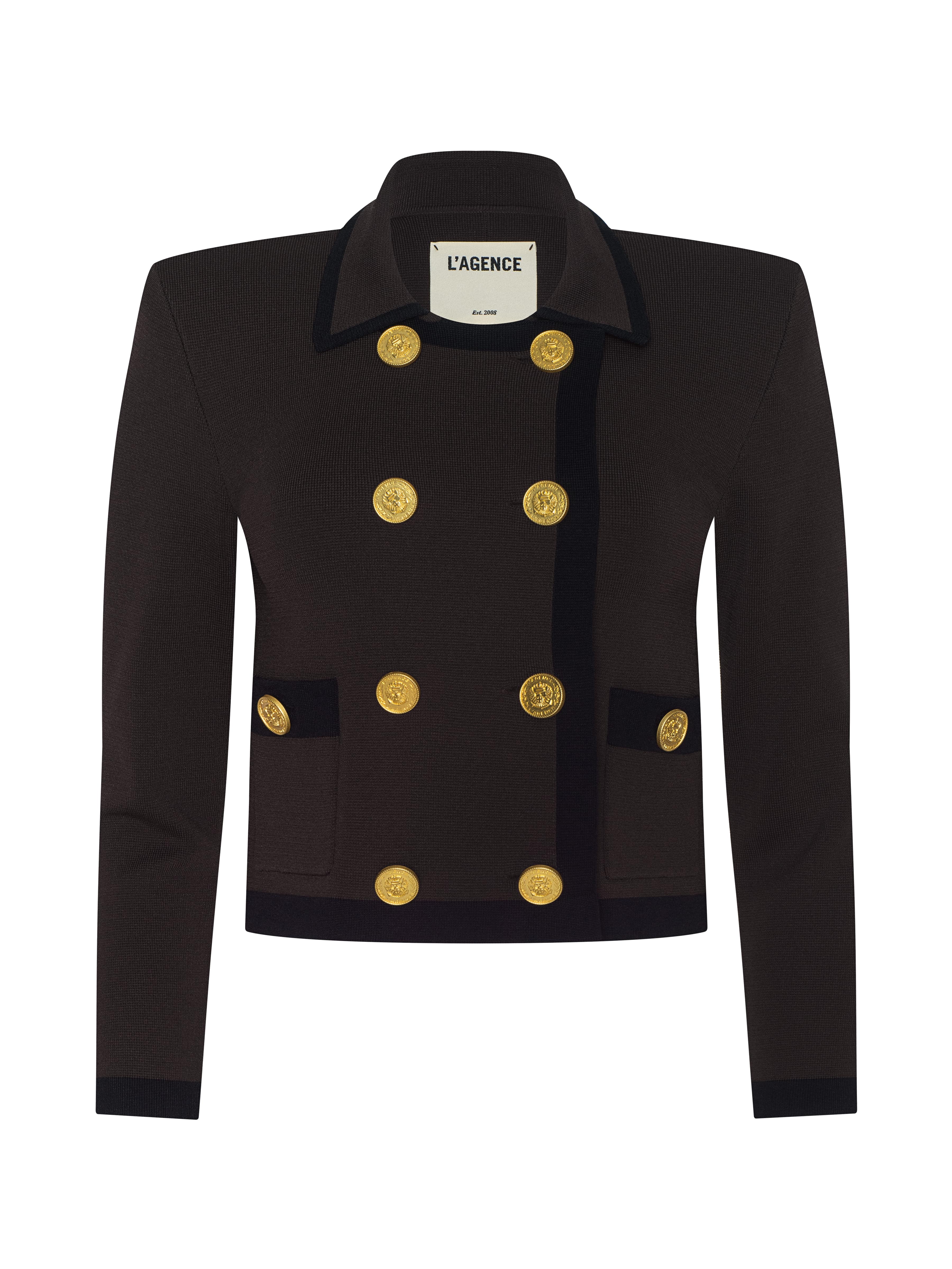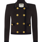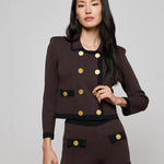 The Janu knit jacket offers modern polish with vintage edge. Crafted in a smooth knit, it features contrast trims and a double-breasted front. Bracelet-length sleeves and a cropped cut give it a refined finish. Style it solo as a top or layer over your favorite tees.