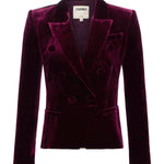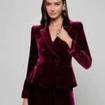 This style was featured in our Fall ‘25 NYFW presentation. The ultra flattering double-breasted blazer featuring a defined, cinched waist. Now in dark port velvet.