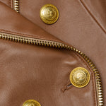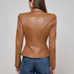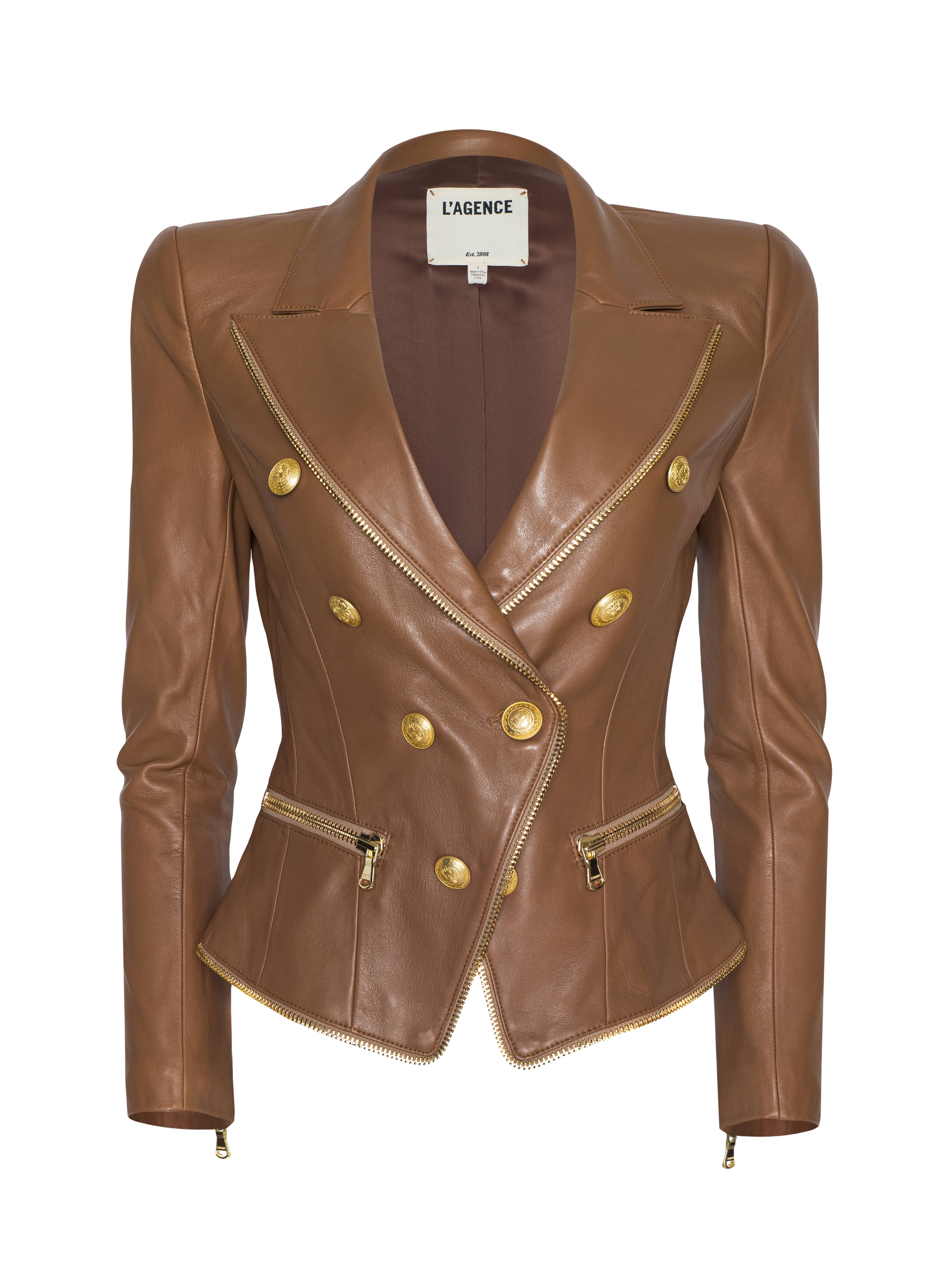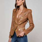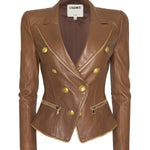 Sculpted and striking, the Ottilie leather blazer in soft cognac is the definition of power dressing. Gleaming gold-tone buttons and exposed zips infuse it with edge, while precision tailoring contours the waist for a sharp, hourglass silhouette. It's part statement, part armor, and it’s made to turn heads.