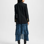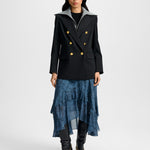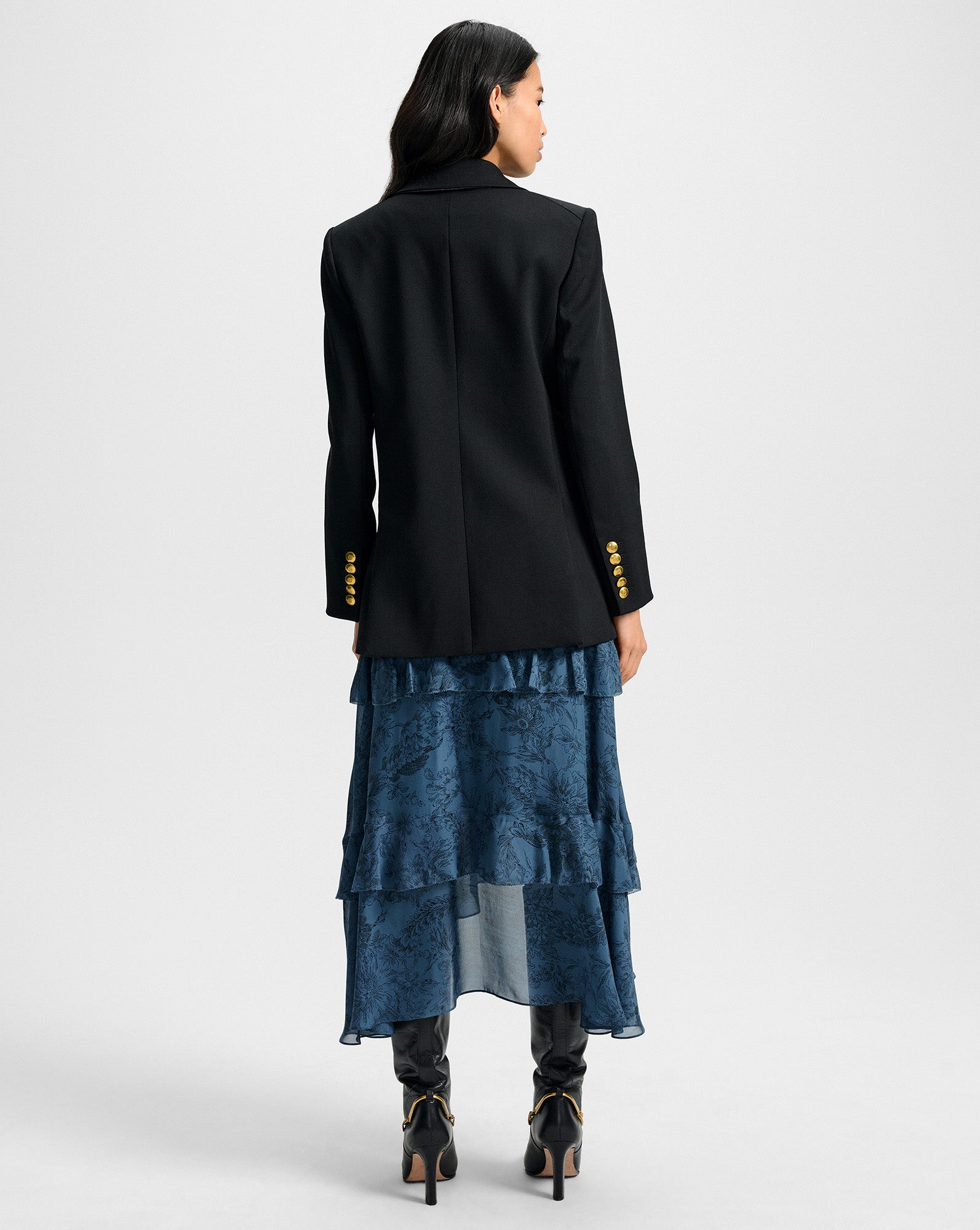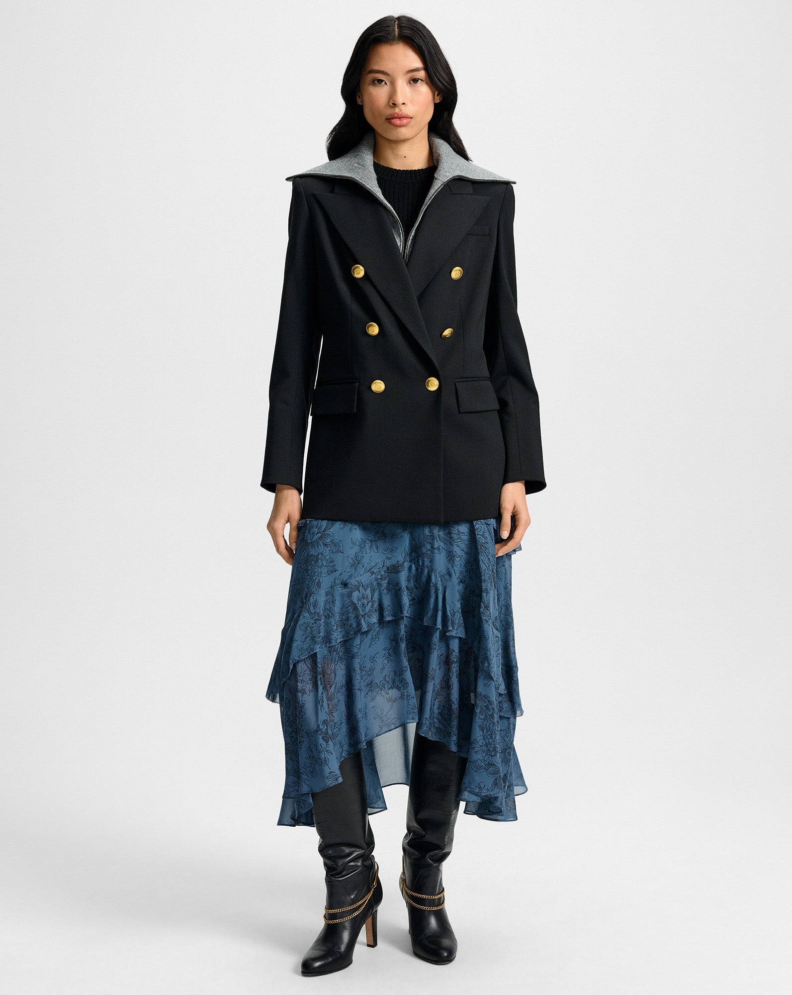 A classic blazer—updated with modern proportions. Crafted from a premium Italian stretch-wool blend, the Rhys is impeccably tailored for a relaxed, oversized fit and elongated silhouette. An exaggerated peak lapel and double-breasted closure with our signature crest buttons complete the look. Compatible with any of our dickeys, this jacket is endlessly versatile—pair with black trousers for a polished set or dress it down with denim.