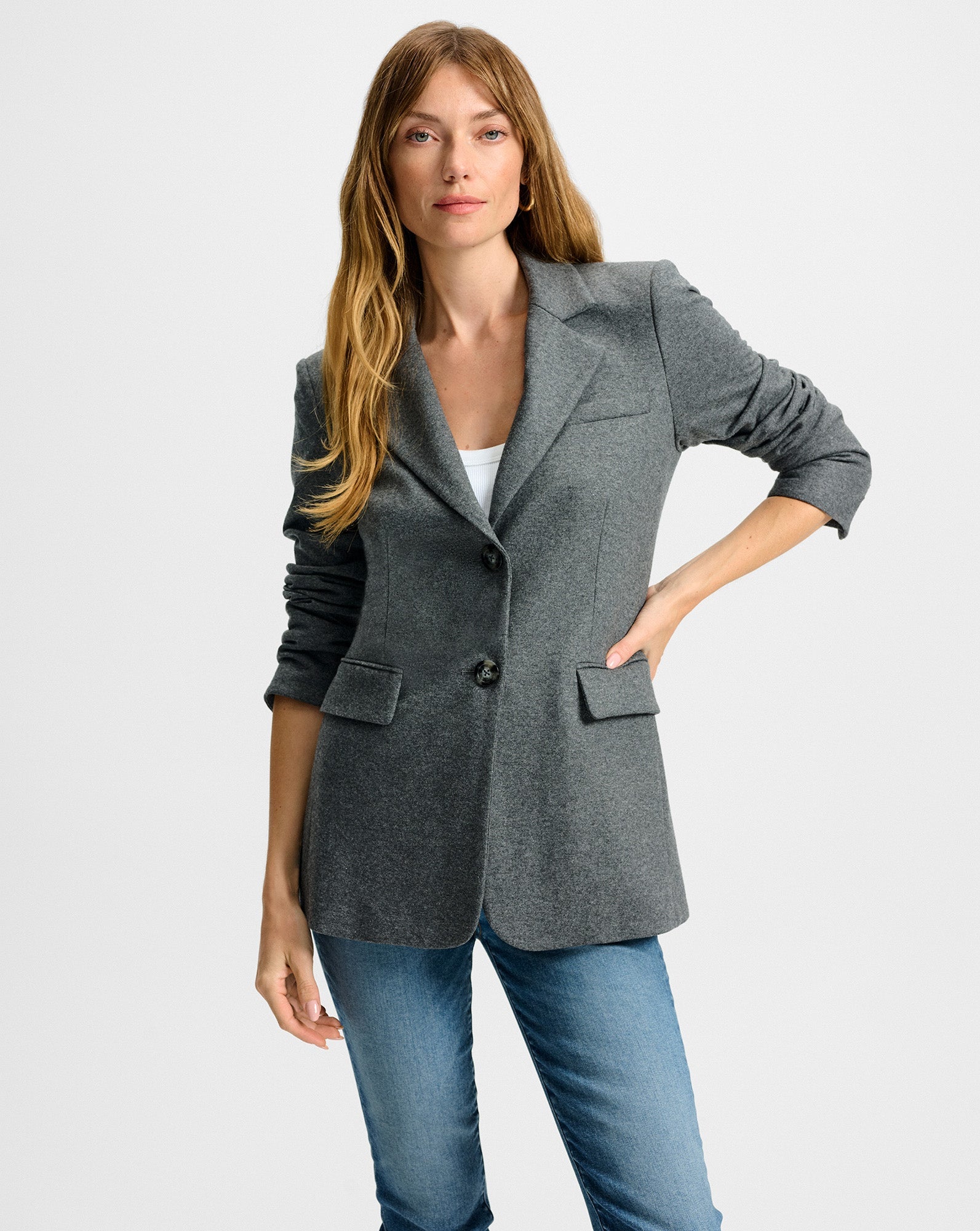Polished and sleek. Expertly tailored from an Italian stretch-wool jersey, the Ryanne is an elongated blazer that’s fitted through the waist for flattering definition, finished with a curved front hem for a clean, modern feel. A notched lapel, front-flap pockets, and tortoise buttons complete the look. Style with the coordinating Marbeau pant for a full tailored look.