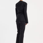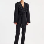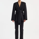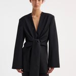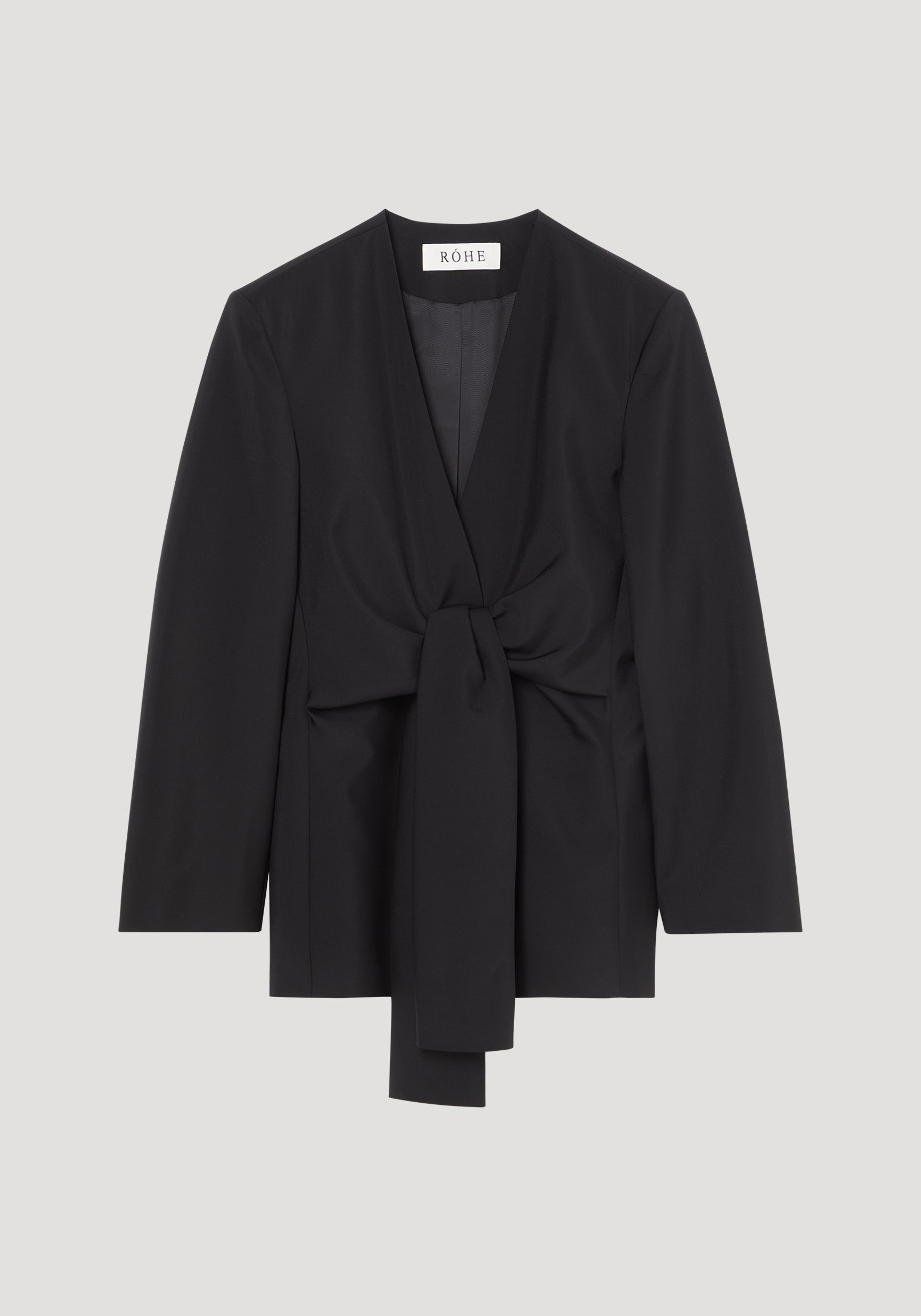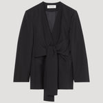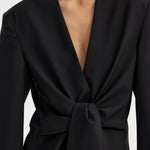 A refined silhouette that blends the structure of tailoring with the elegance of a wrap design. This blazer-inspired top features a low V-neckline, cinched sleeves and a wrap waist for a sculptural feminine shape.