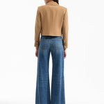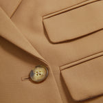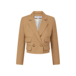 A fashion-forward take on the classic double-breasted blazer. A master class in precision tailoring, the Wilkie jacket is made from premium stretch wool and is defined by a coolly cropped silhouette that hits high on the waist. Strong padded shoulders, four flap pockets, and tortoiseshell buttons complete the look. In versatile hazelnut brown, this standout style elevates everything from jeans to workwear. For a memorable power suit, pair with the coordinating Wisteria pant.