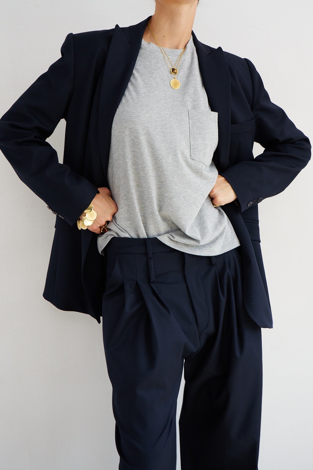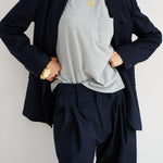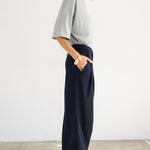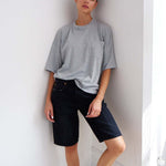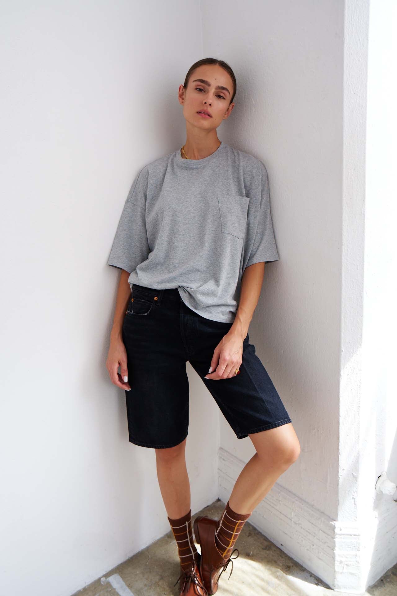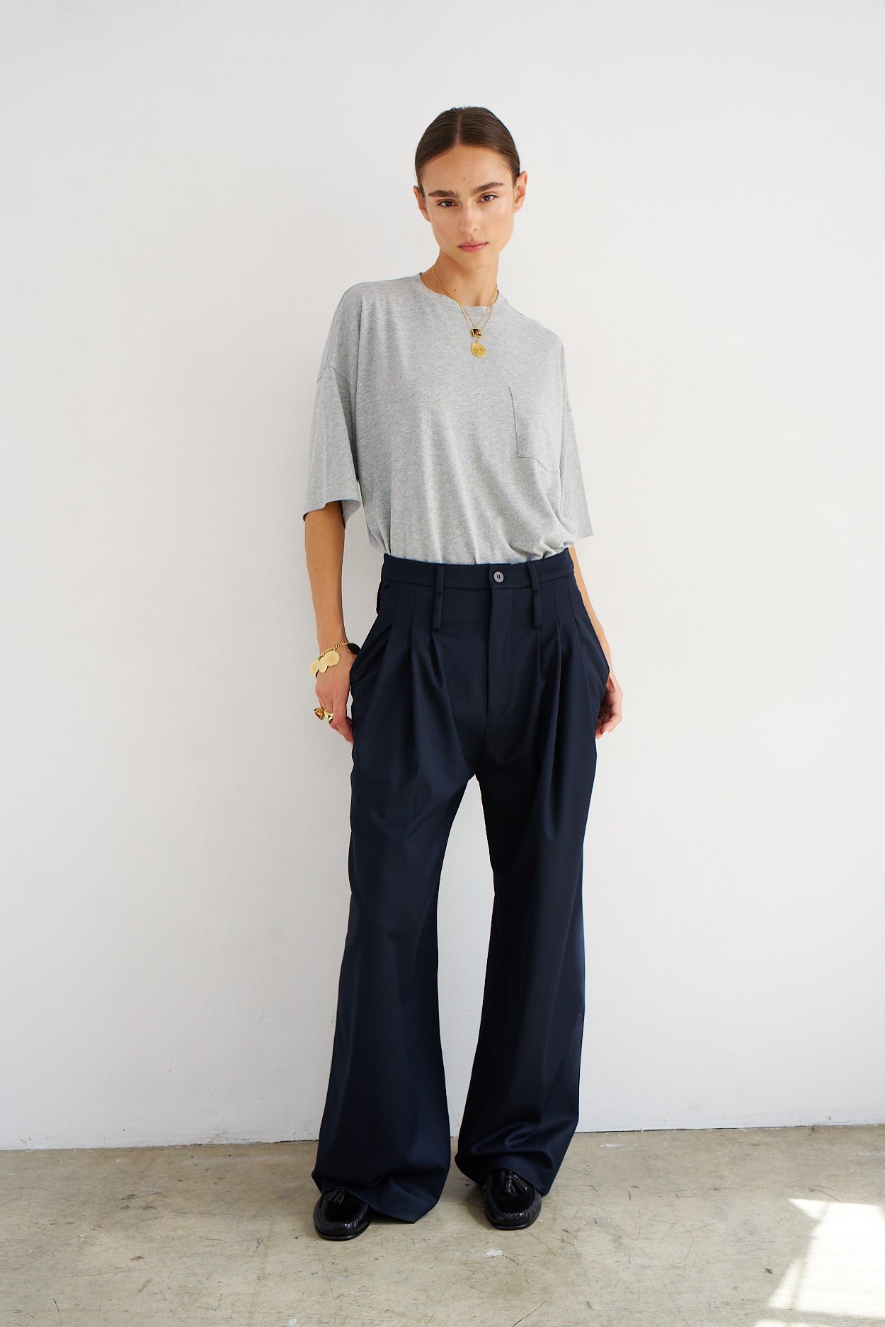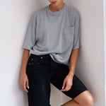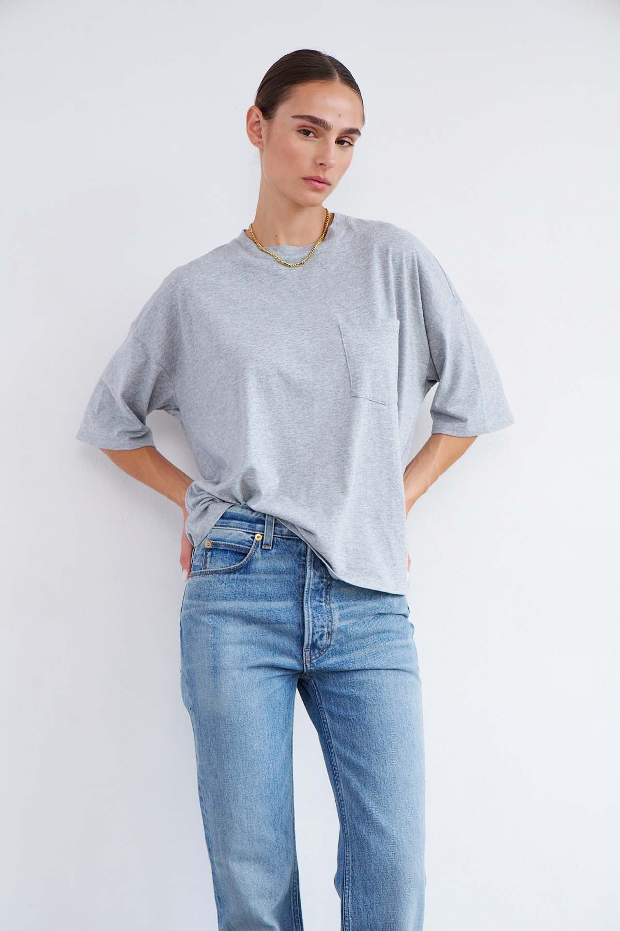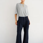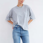 A crew neck tee with a dolman inspired loose-ish fit. Boyish inspiration with feminine drape creates modern, understated, casual appeal. A boxy fit creates beautiful shape when tucked and modern structure when undone. Cut in a soft multi-ply Japanese cotton modal jersey. Piece dyed for deep color saturation and preshrunk for fit continuity.