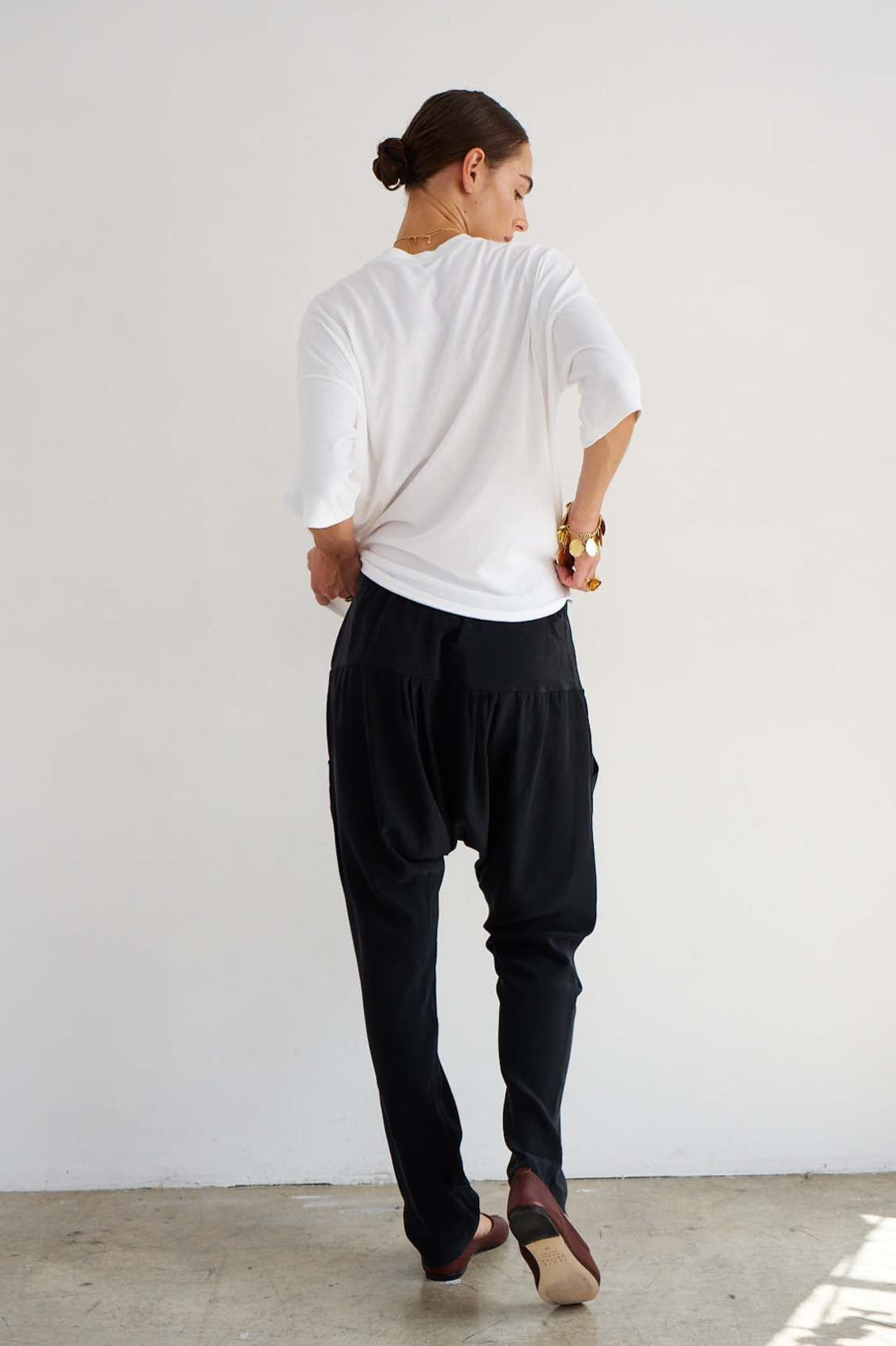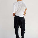 A crew neck tee with a dolman inspired loose-ish fit. Boyish inspiration with feminine drape creates modern, understated, casual appeal. A boxy fit creates beautiful shape when tucked and modern structure when undone. Cut in a soft multi-ply Japanese cotton modal jersey. Piece dyed for deep color saturation and preshrunk for fit continuity.