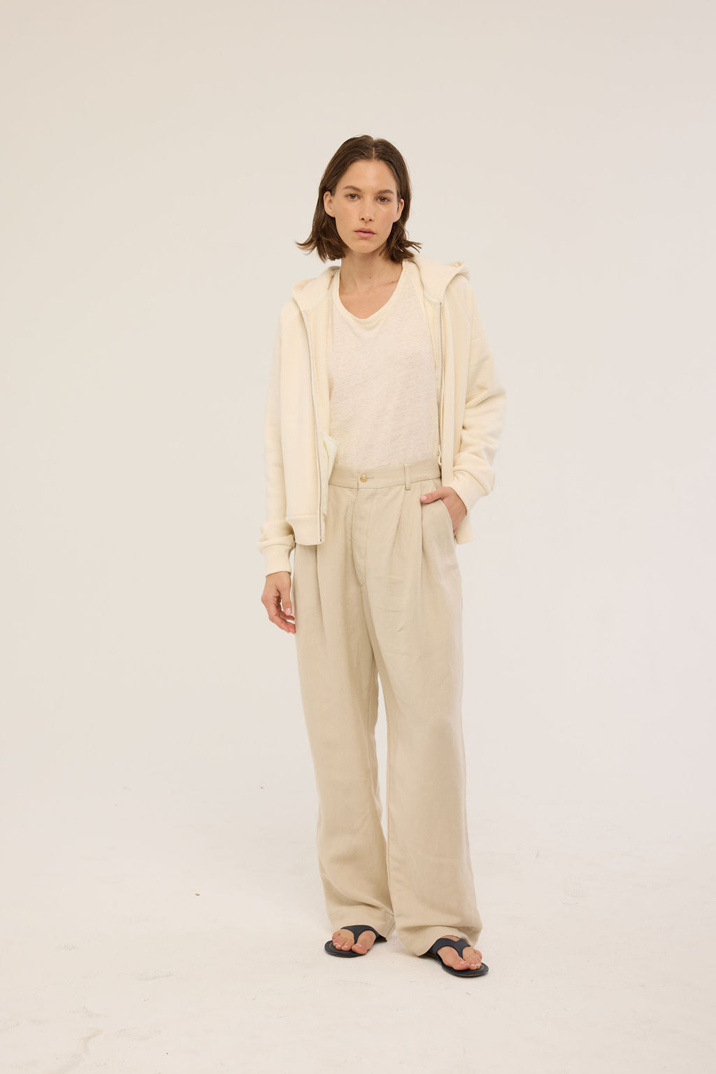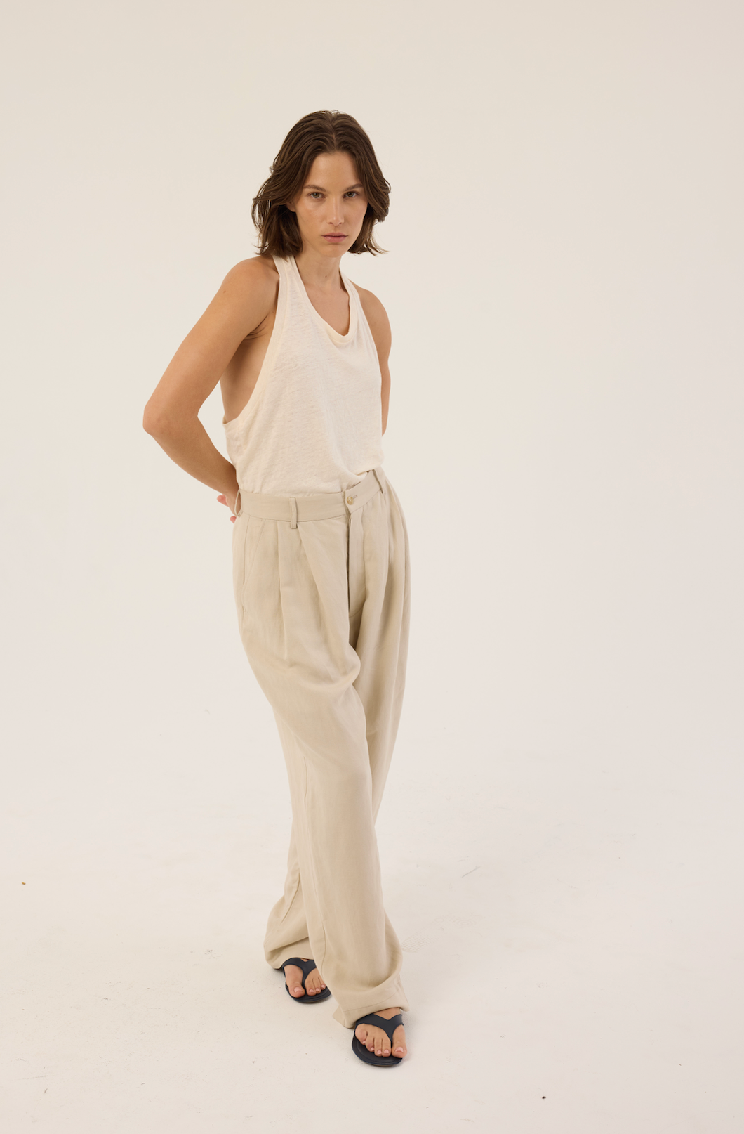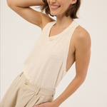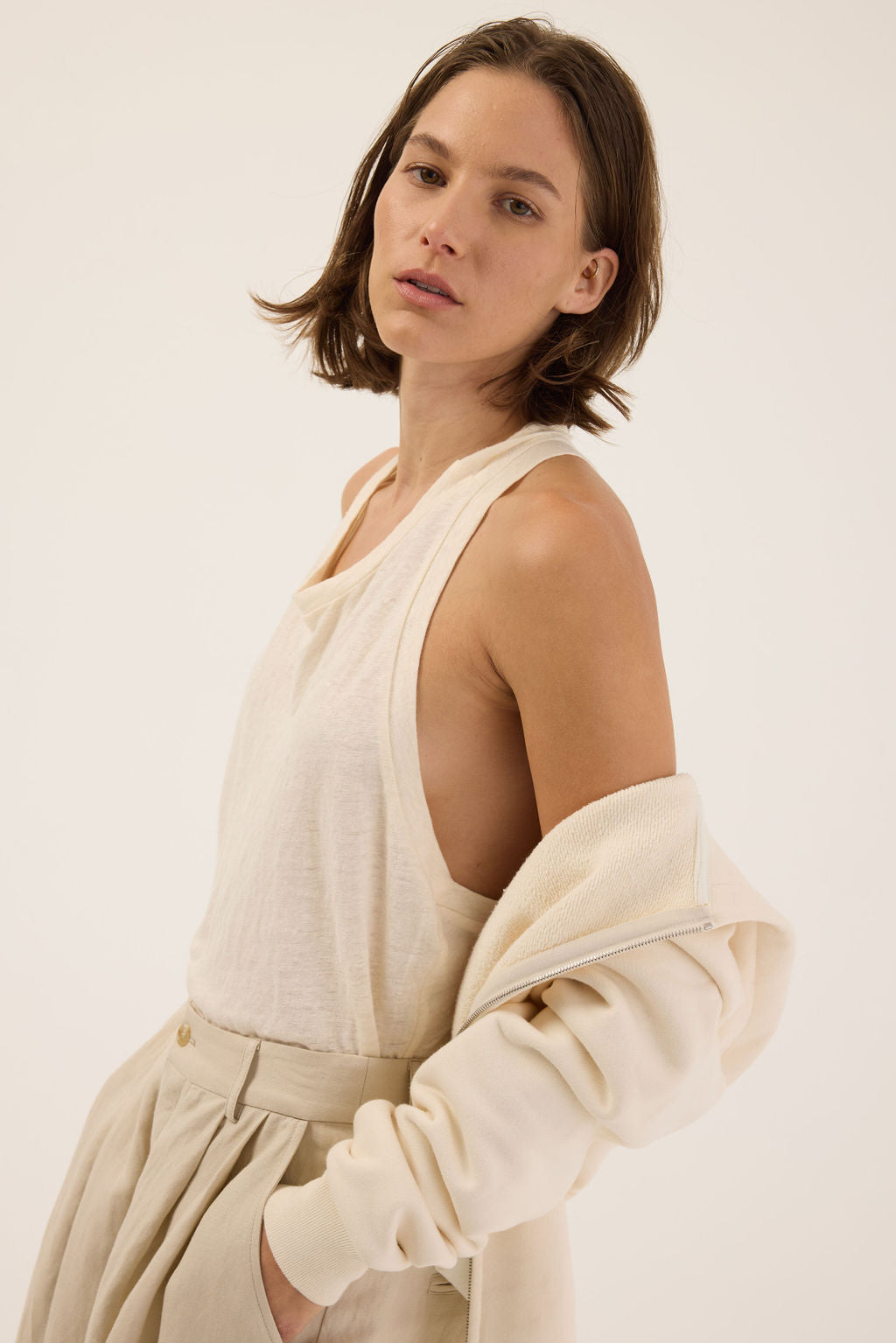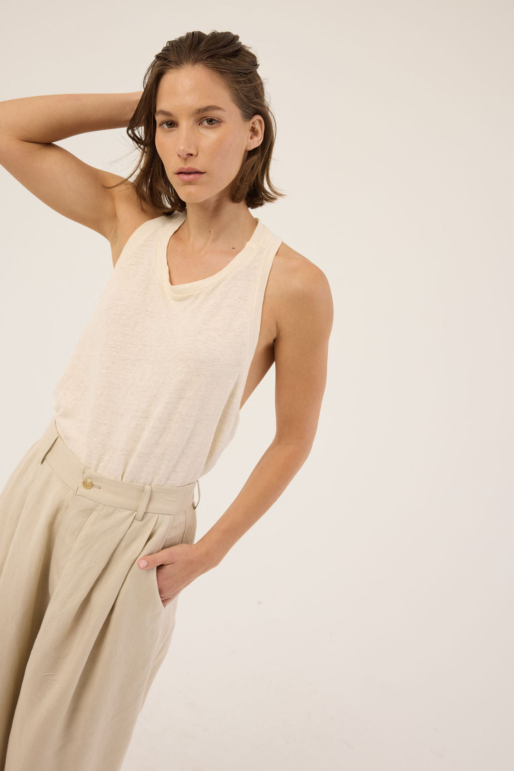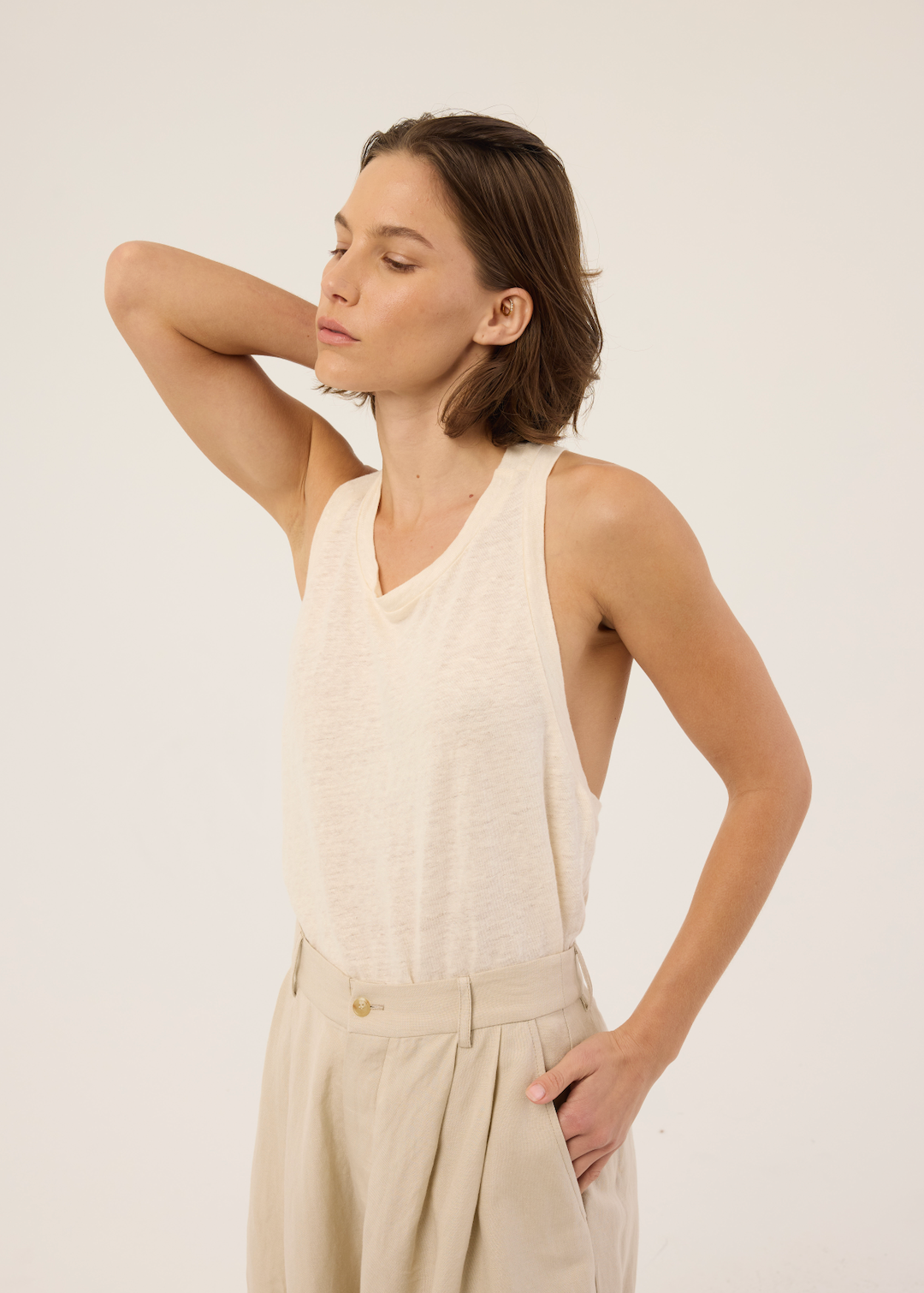 A modern tank with a racer back cutaway.  Cut narrow in the shoulder, wide across the chest, low on the sides and low in the back.  Tailored in European Linen Jersey, piece dyed and preshrunk for fit continuity.