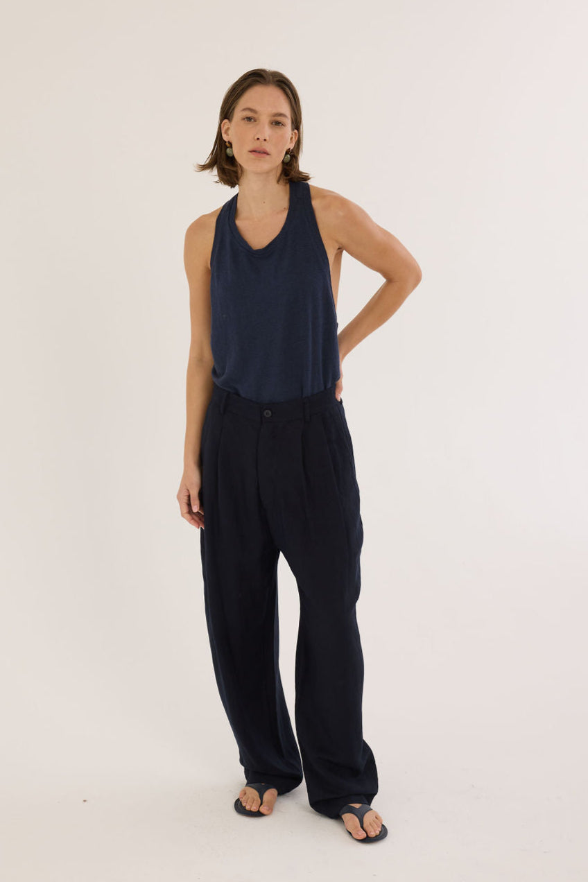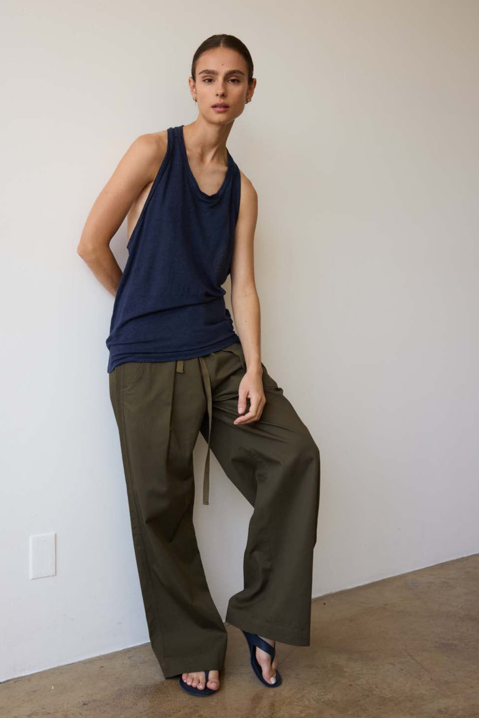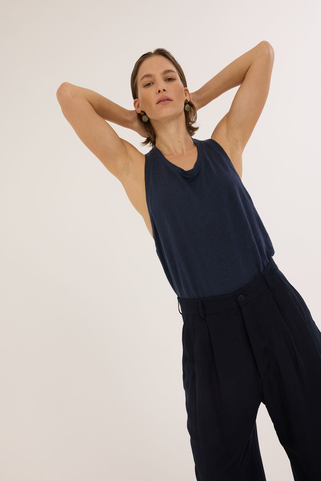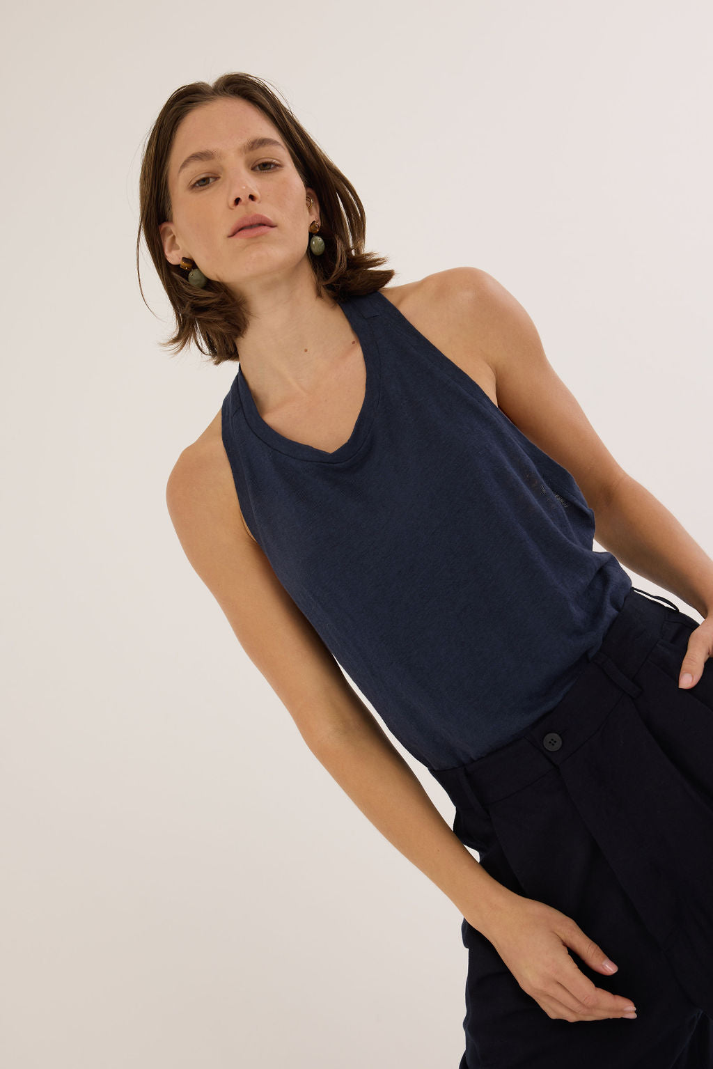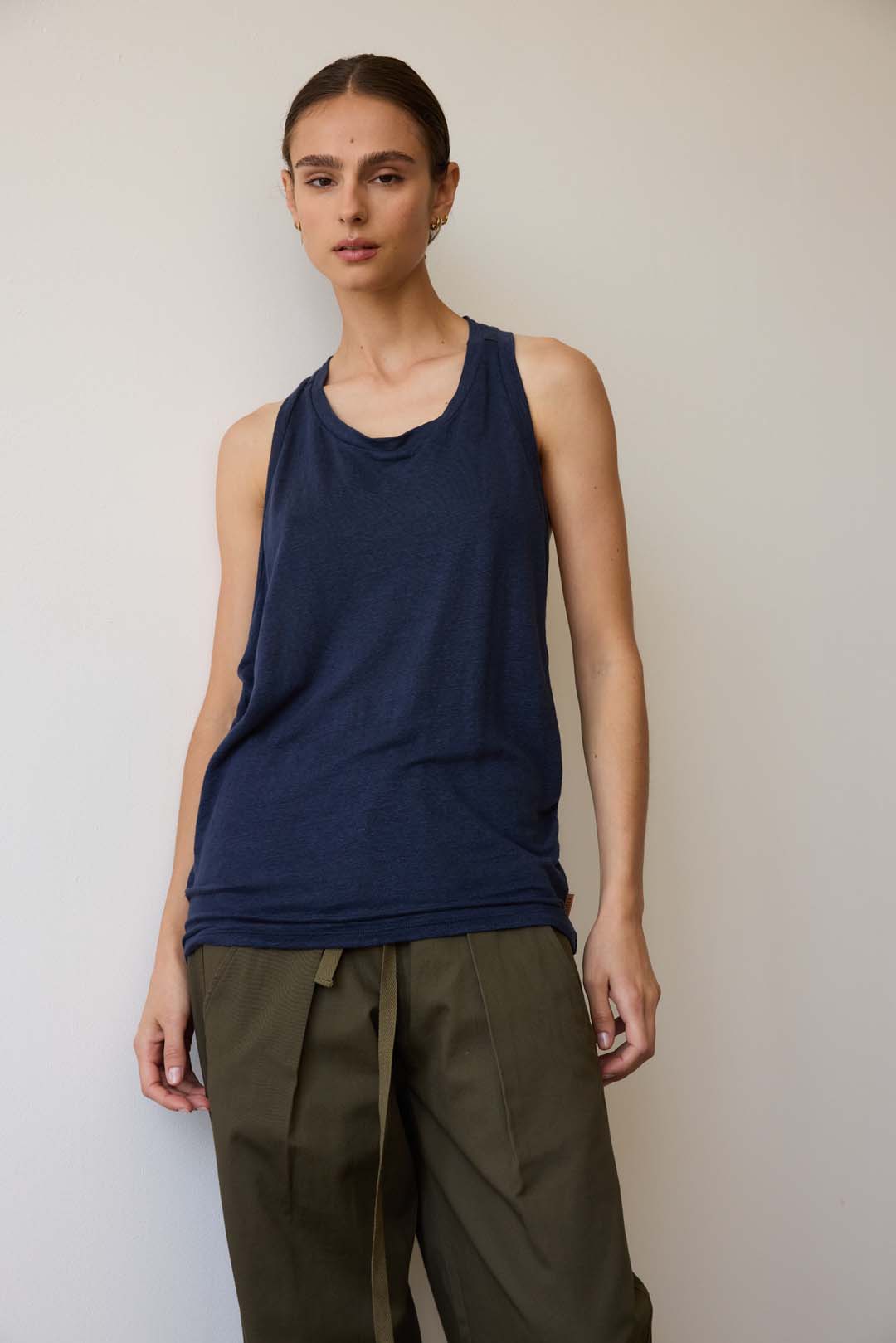 A modern tank with a racer back cutaway.  Cut narrow in the shoulder, wide across the chest, low on the sides and low in the back.  Tailored in European Linen Jersey, piece dyed and preshrunk for fit continuity.