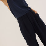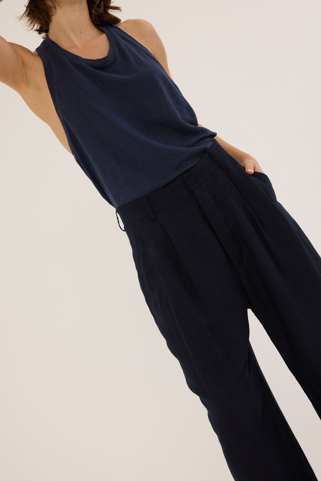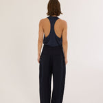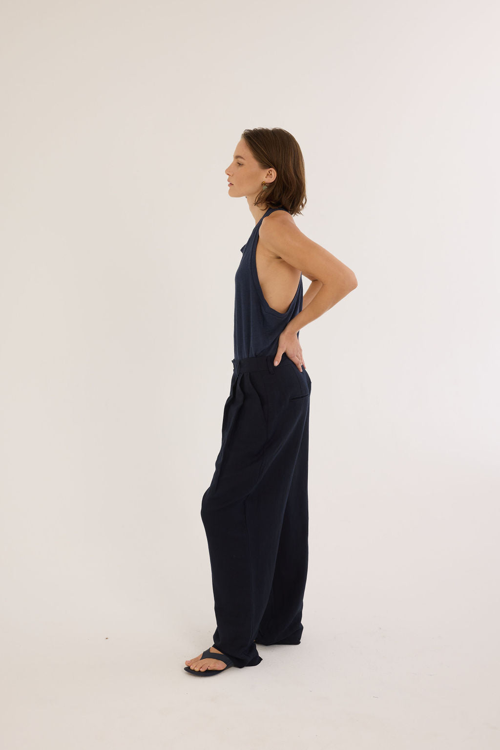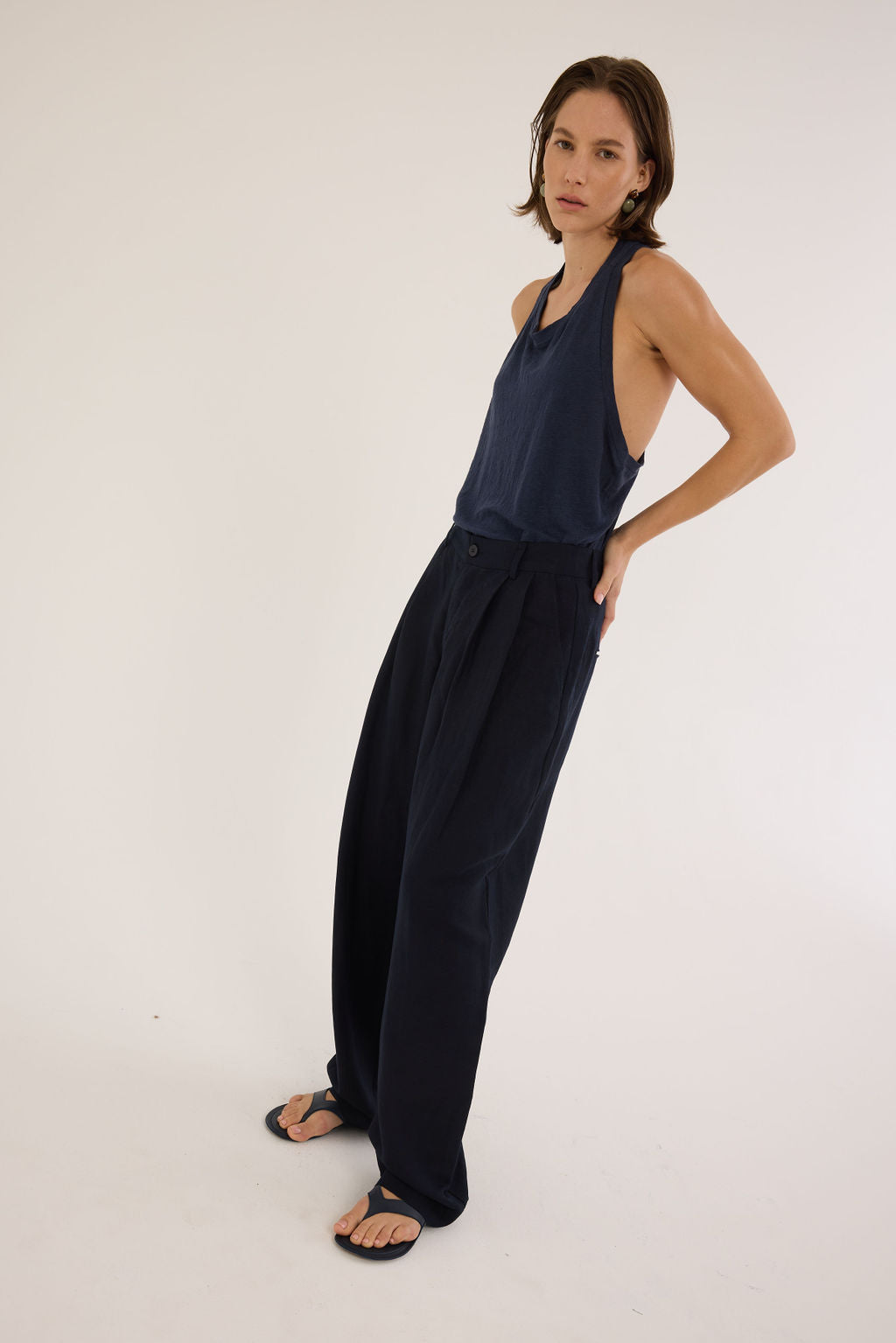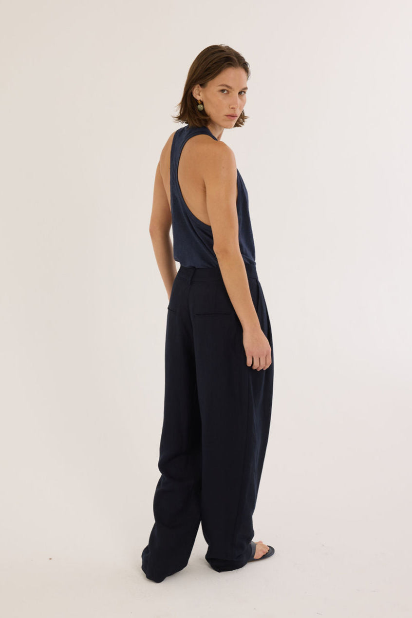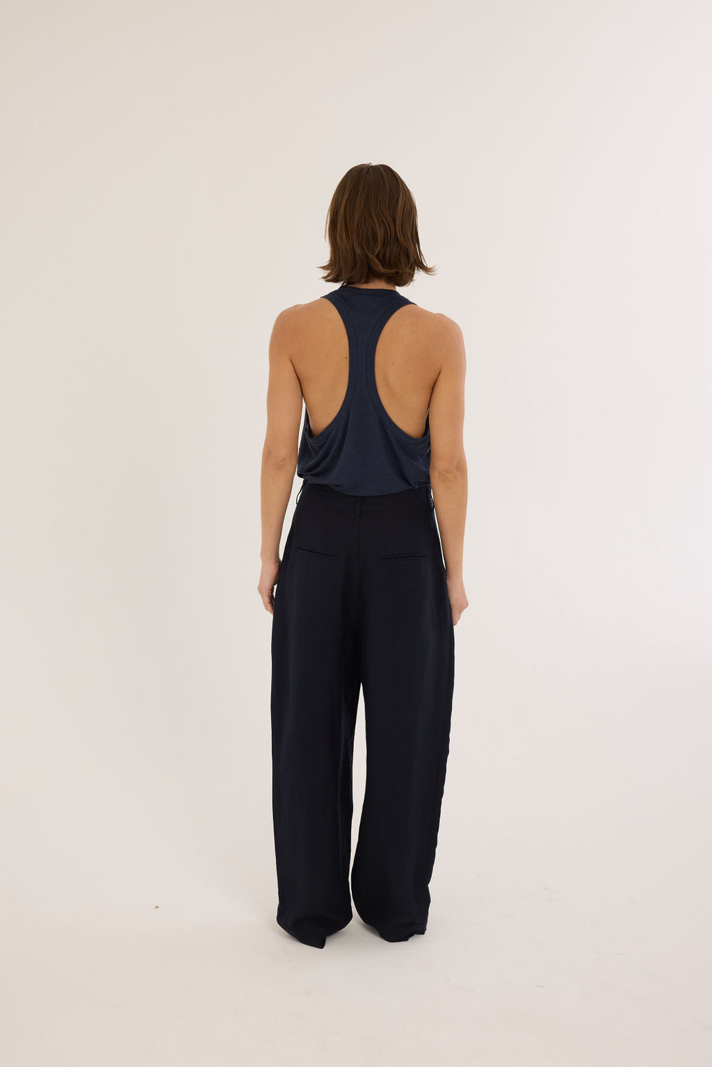 A modern tank with a racer back cutaway.  Cut narrow in the shoulder, wide across the chest, low on the sides and low in the back.  Tailored in European Linen Jersey, piece dyed and preshrunk for fit continuity.