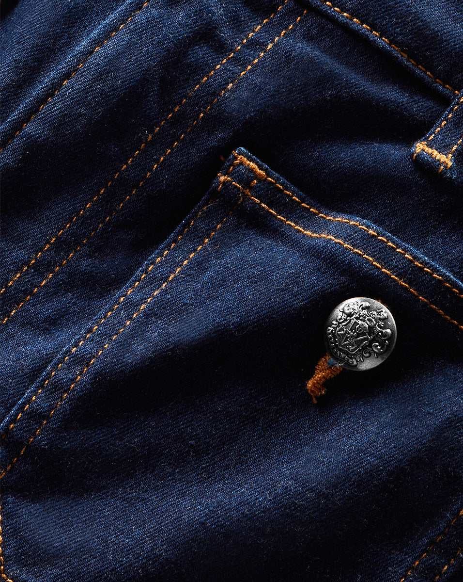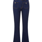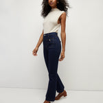 The Carson jean, now updated with patch pockets, decorative crest buttons, and contrast stitching. This style also features a high-rise silhouette that is fitted through the hips and thighs with a cropped, flared leg. We use the highest quality stretch denim, which means this pair has the most flattering fit and a quick recovery. The dark blue wash, meanwhile, makes it the perfect base to style back to all your new knits and tops.