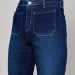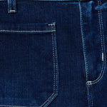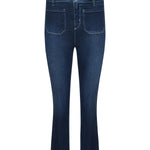 An easy cropped kick-flare jean with the polished look of a trouser. Patch pockets add a subtle retro appeal. Now in a dark blue wash with slight fading designed to contour the leg for a flattering, lengthening effect.