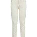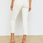 An indespensible high-rise cropped jean in premium stretch denim and macadamia-ivory hue. Contrast topstiching highlights classic five-pocket construction. Chic, effortless style includes a slim straight leg finished with a clean raw hem and a zip fly closure.