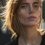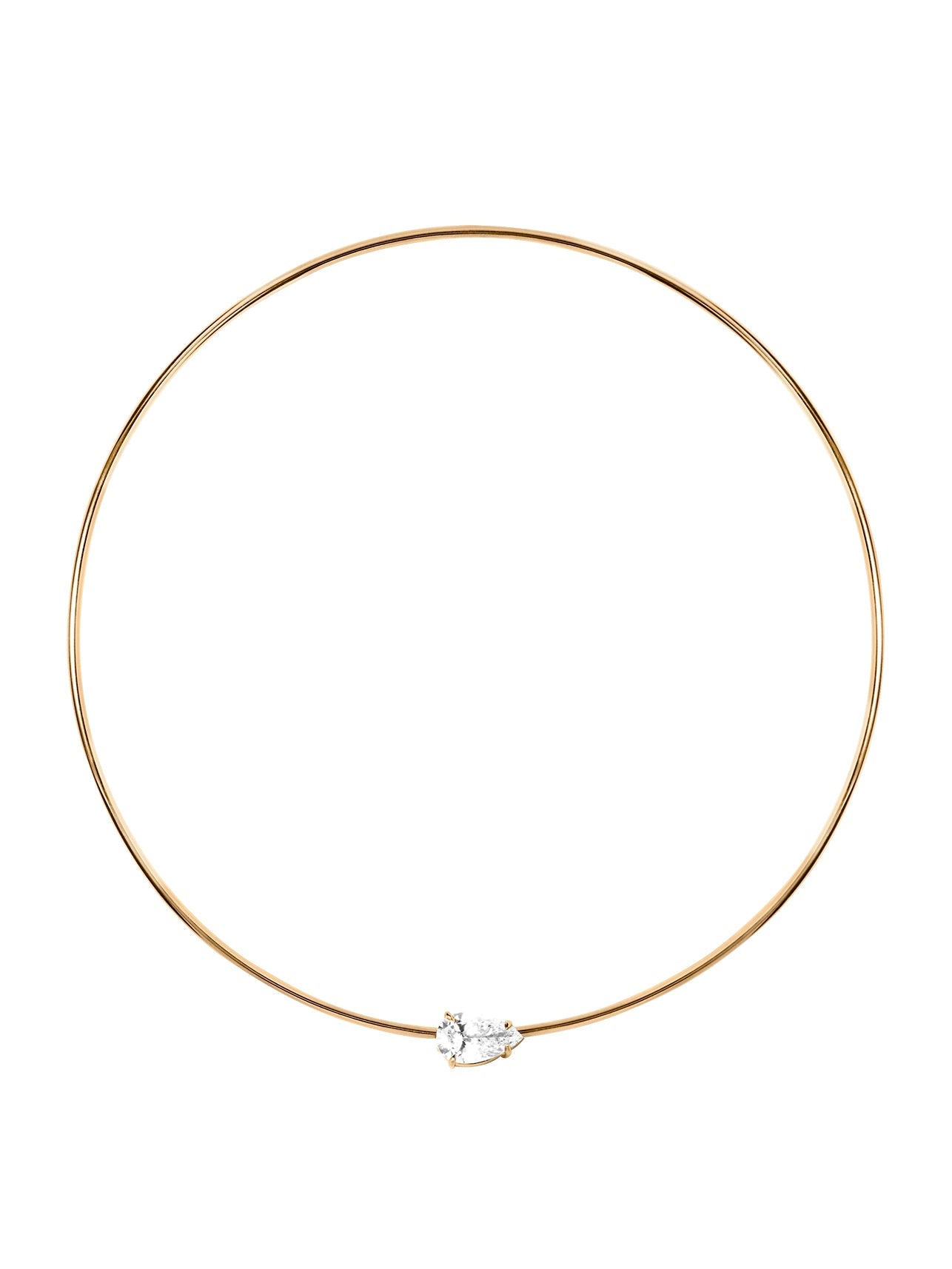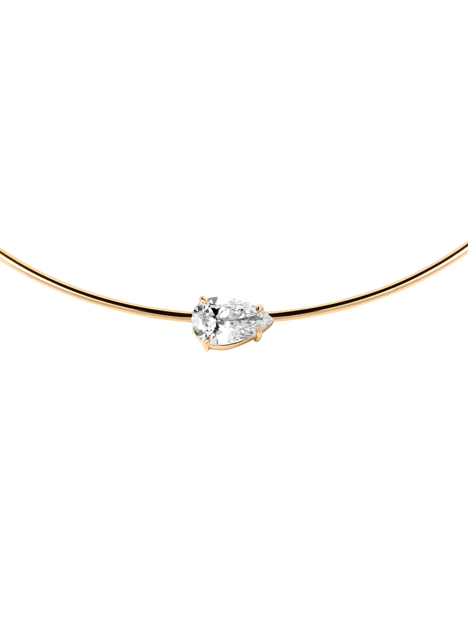 Made to order in 14k yellow or white gold, this minimalist curved wire choker is designed to rest elegantly at the collarbone. A single 3.00 carat pear-cut lab-grown diamond makes a bold statement at the base, blending sculptural simplicity with striking brilliance.