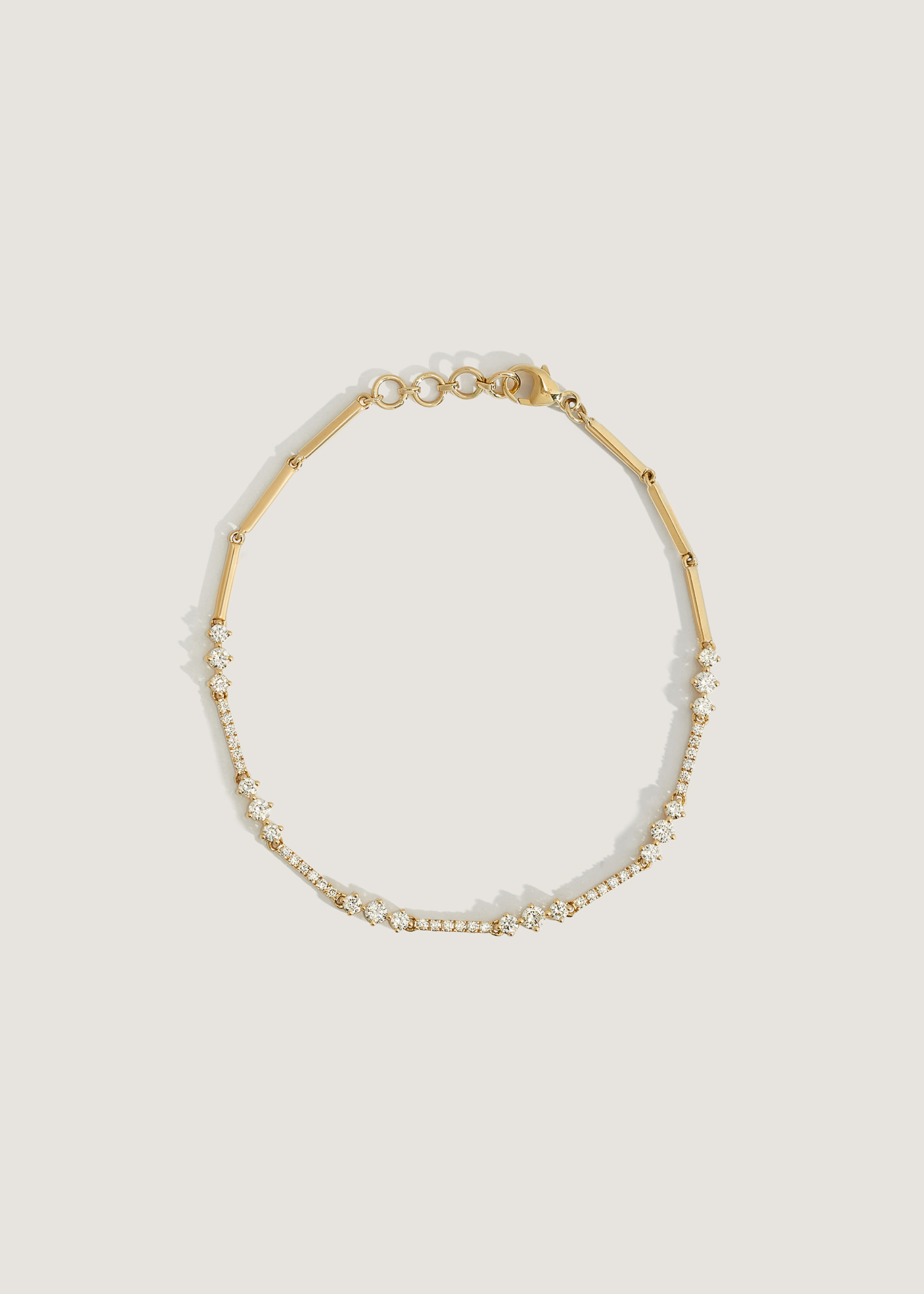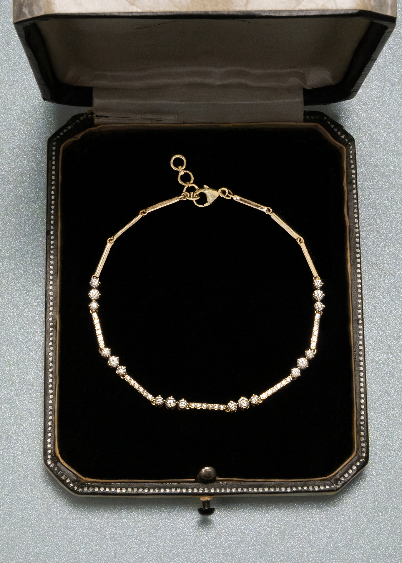 A fluid rhythm of light and movement. The Alina Bracelet weaves trios of diamonds and solid14k gold, creating a unique pattern that catches the eye with effortless shine. Designed to flow seamlessly on the wrist, it’s a modern classic that balances ease with undeniable presence.