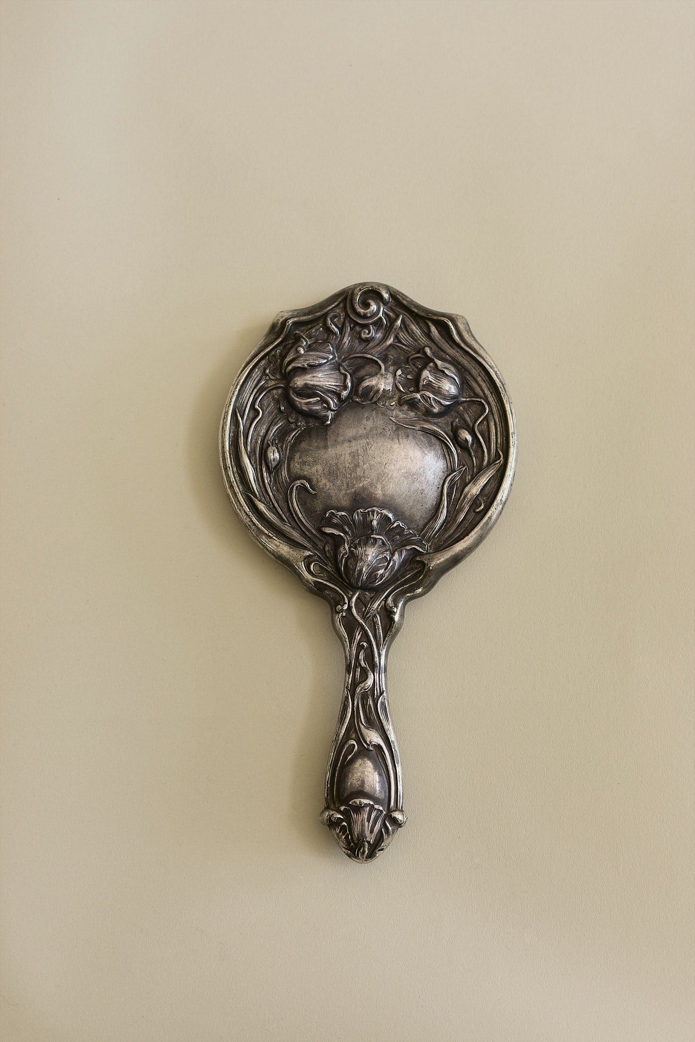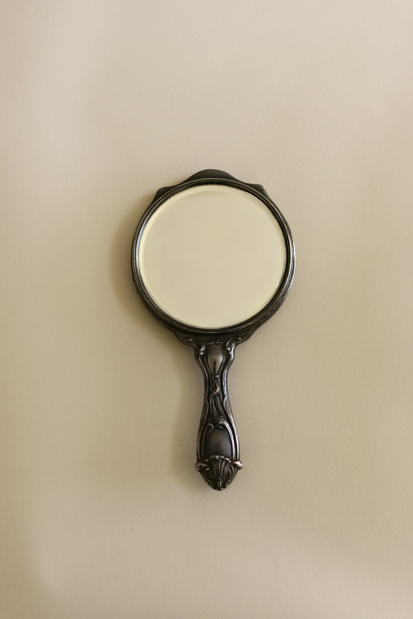A turn-of-the-century hand mirror with soft curves and quiet ornamentation, collected for the way it elevates even the smallest rituals. Its worn silver tone and delicate handle carry the marks of a life well lived—soon to reflect new stories from your hands.