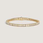 Iconic elegance. This tennis bracelet features a stunning strand of vertically channel-set baguette diamonds in 14k yellow gold. Made for moments of quiet luxury—think sipping Champagne with a side of strawberries and cream. It’s a modern take on a timeless classic, designed to become a tradition of its own.