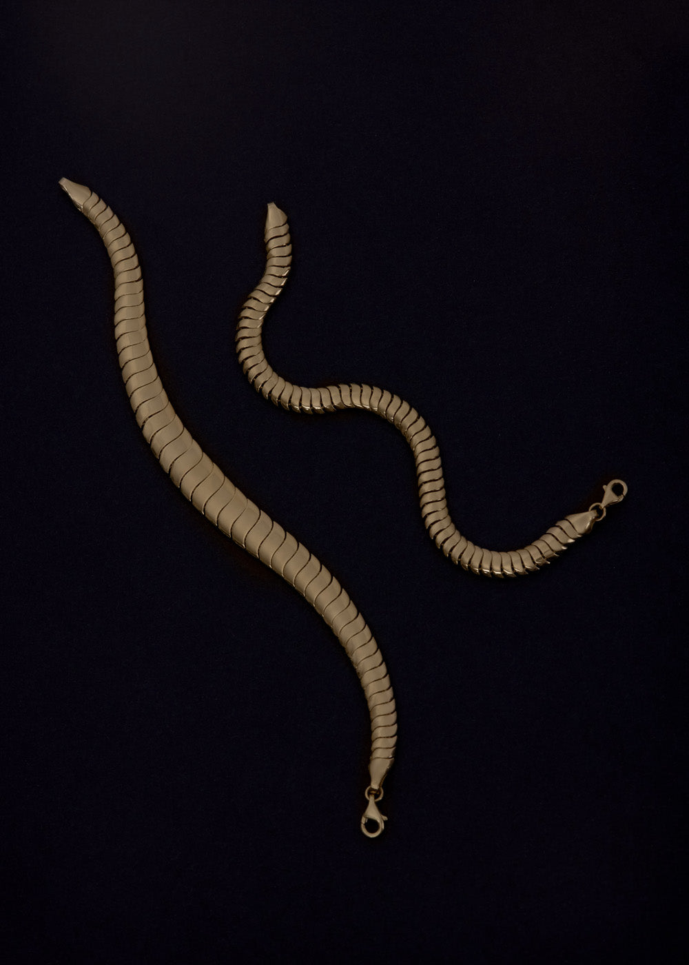 Our Cobra chain links are delicately crafted and hollow. Please handle with care, coiling and securely storing when not in use. For optimal longevity, it’s recommended to remove the bracelet during strenuous activities, as dented links cannot be repaired.
