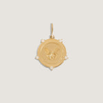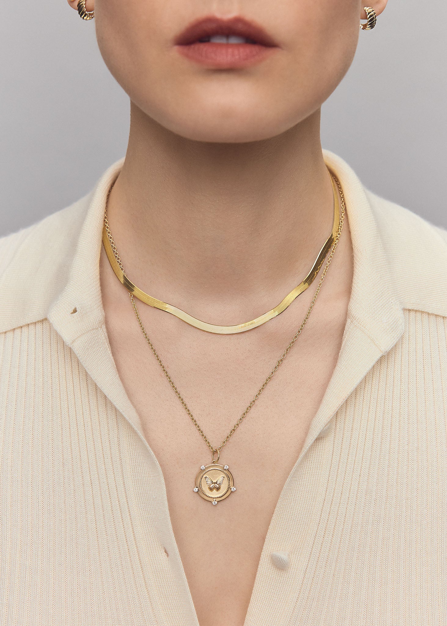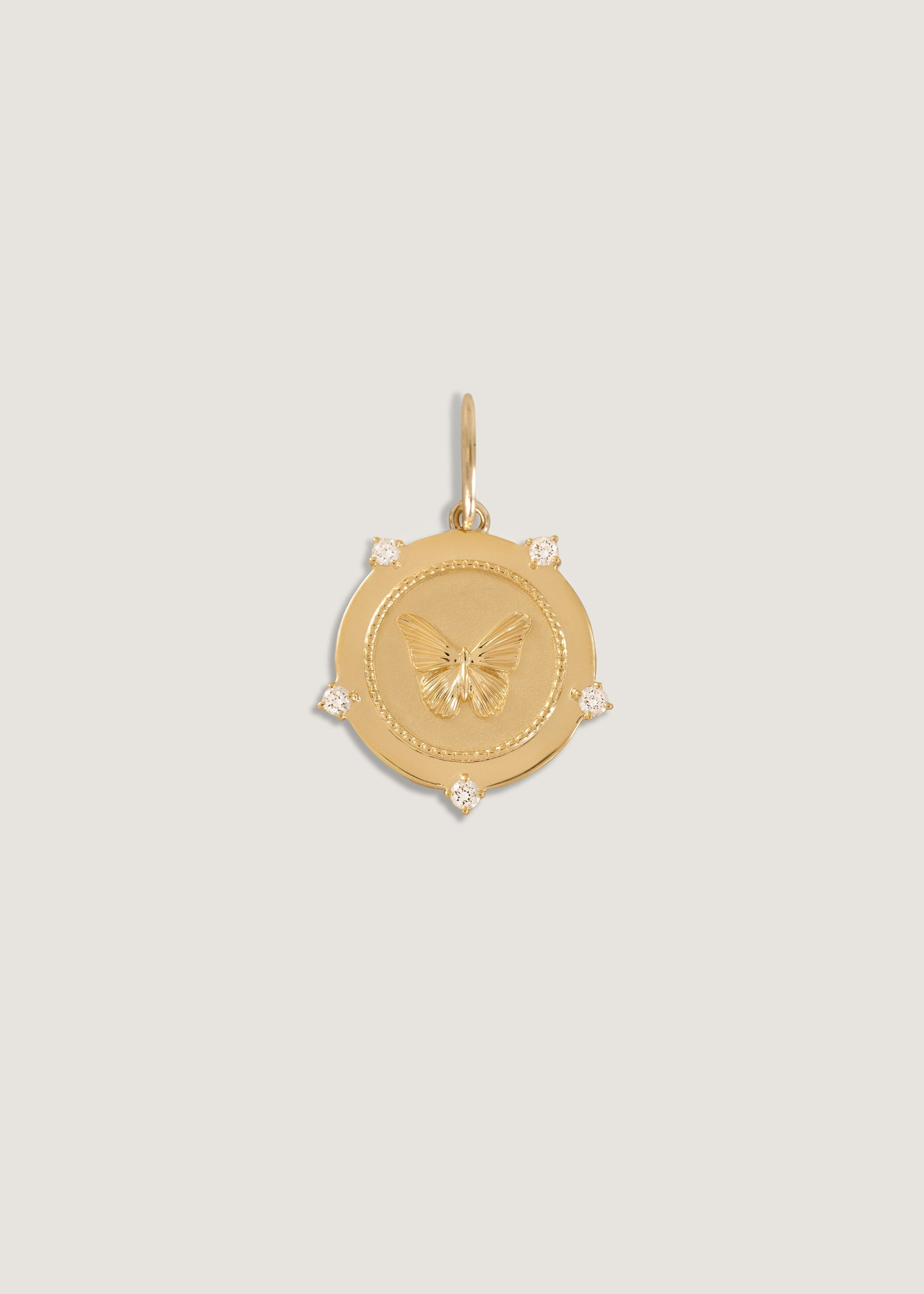 A classic coin pendant featuring a butterfly motif with five surrounding diamonds along the edge—pair with your favorite chains for a variety of looks.