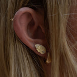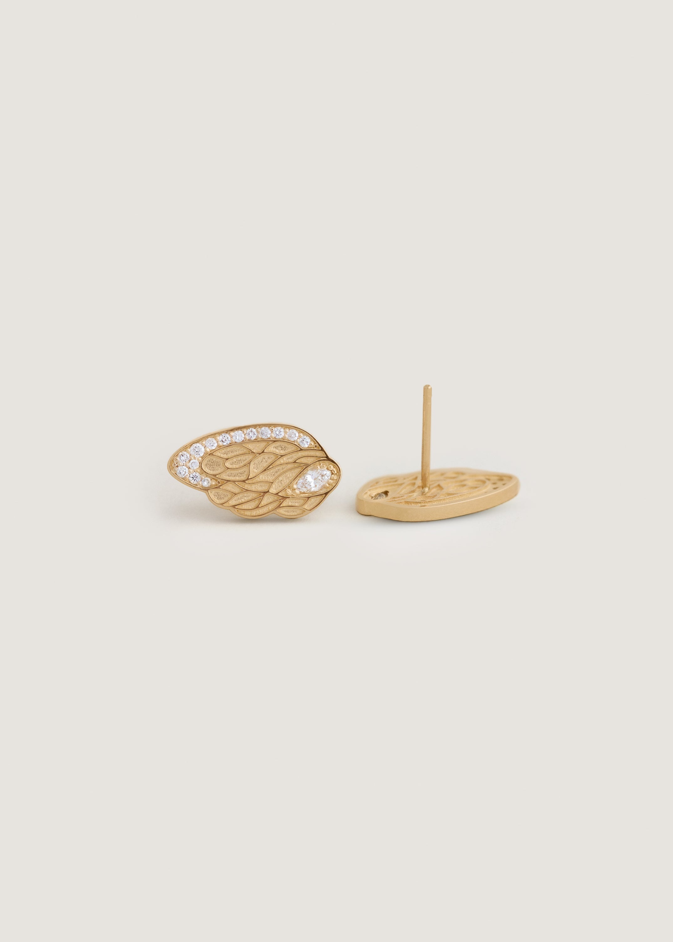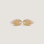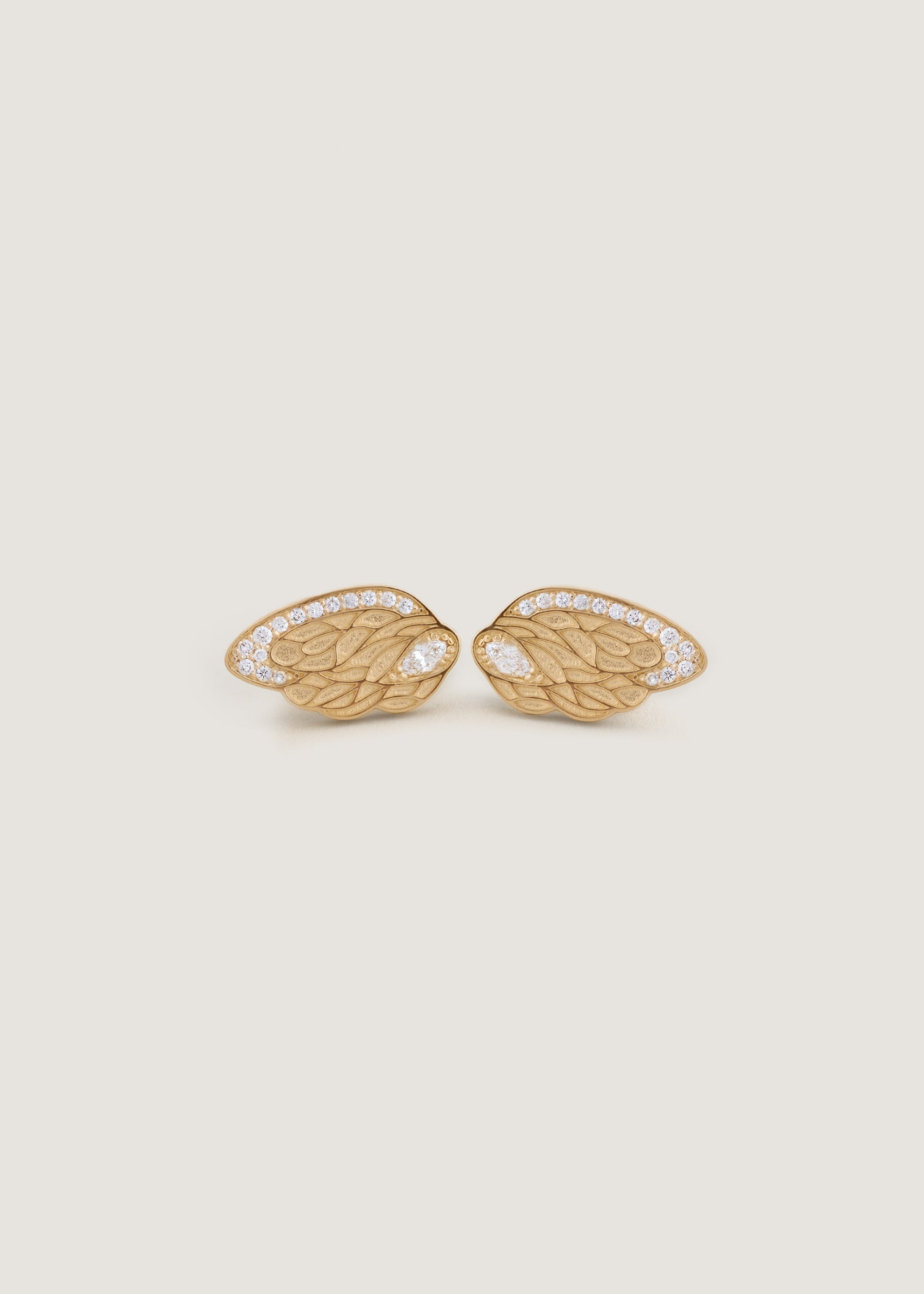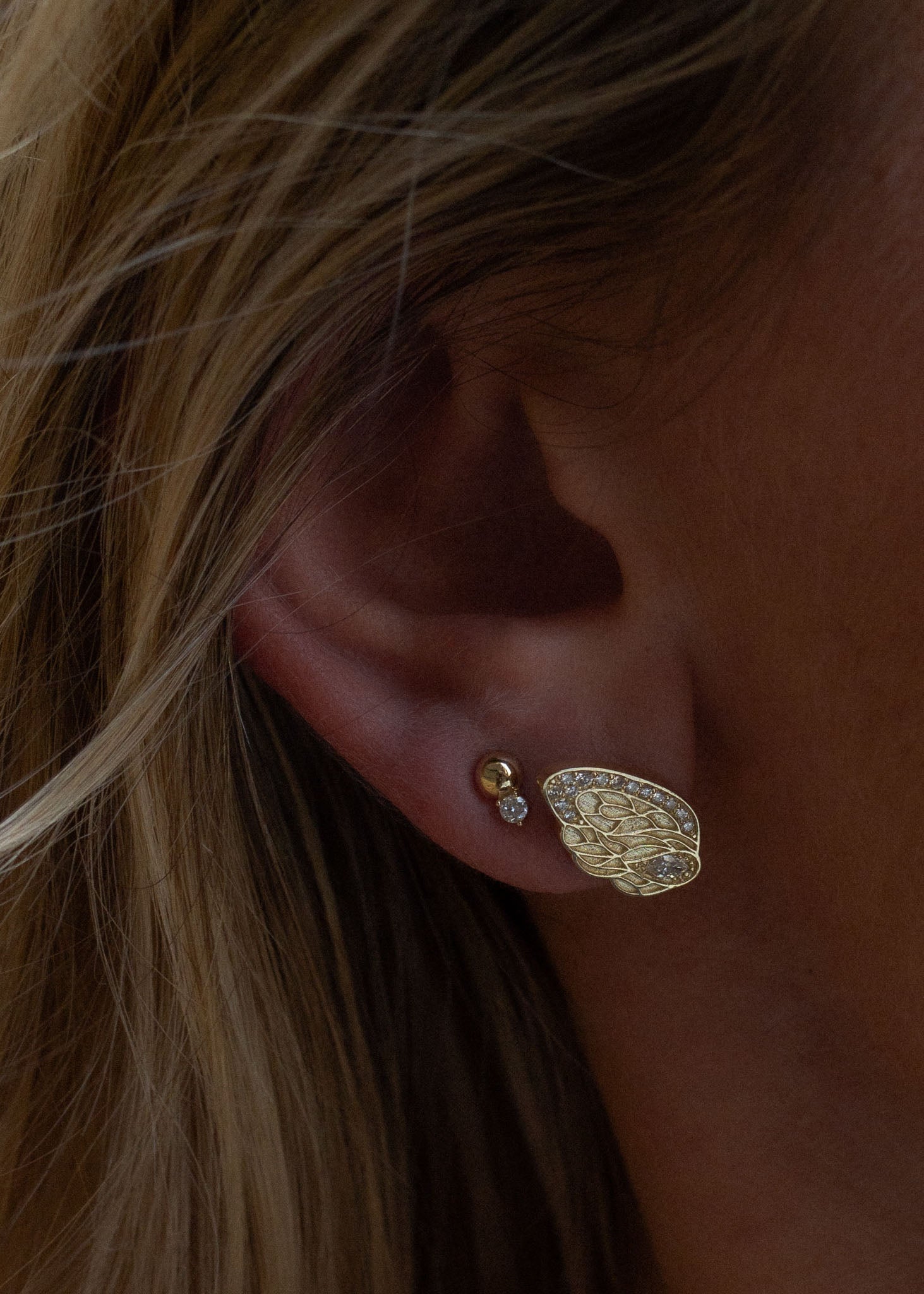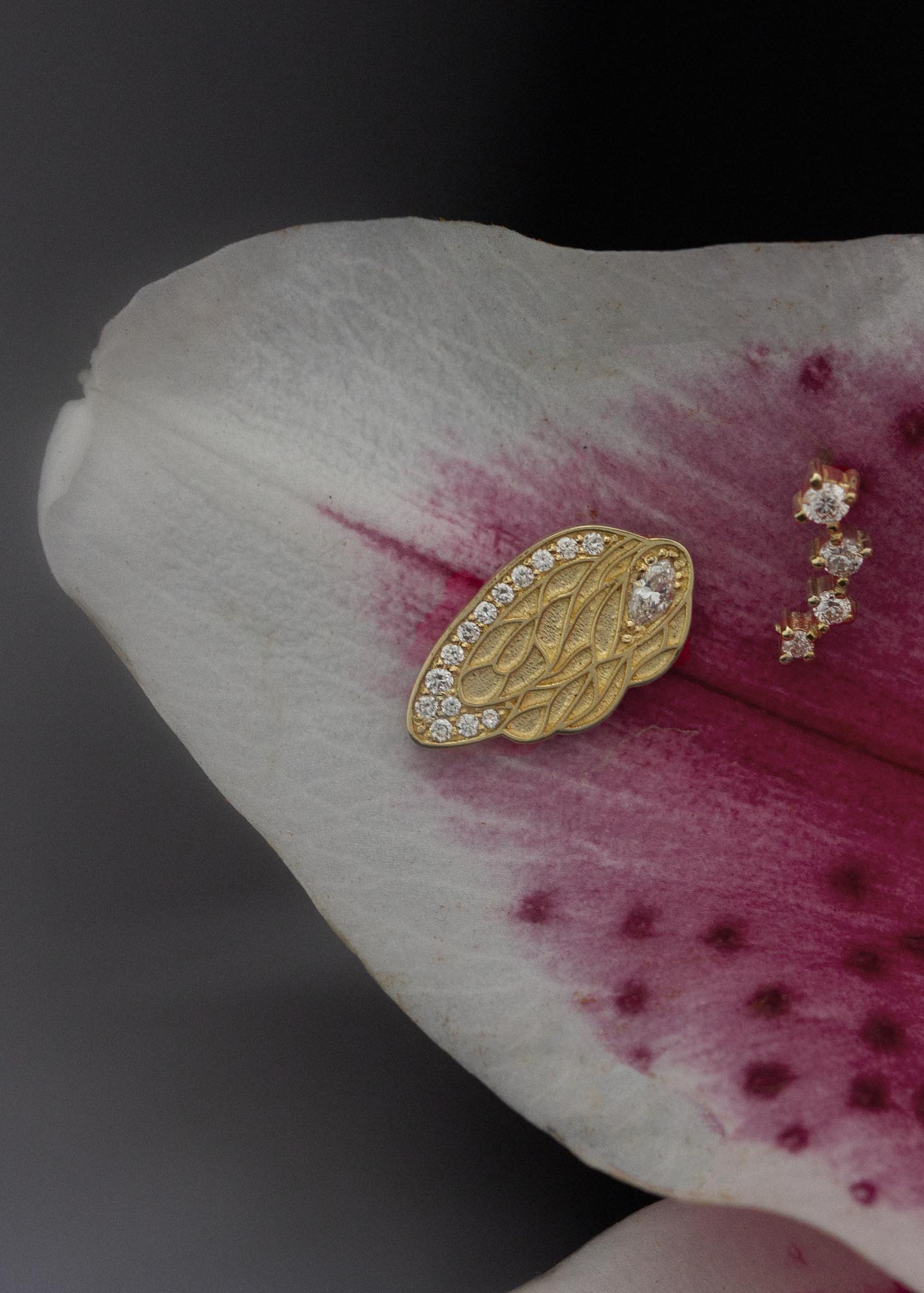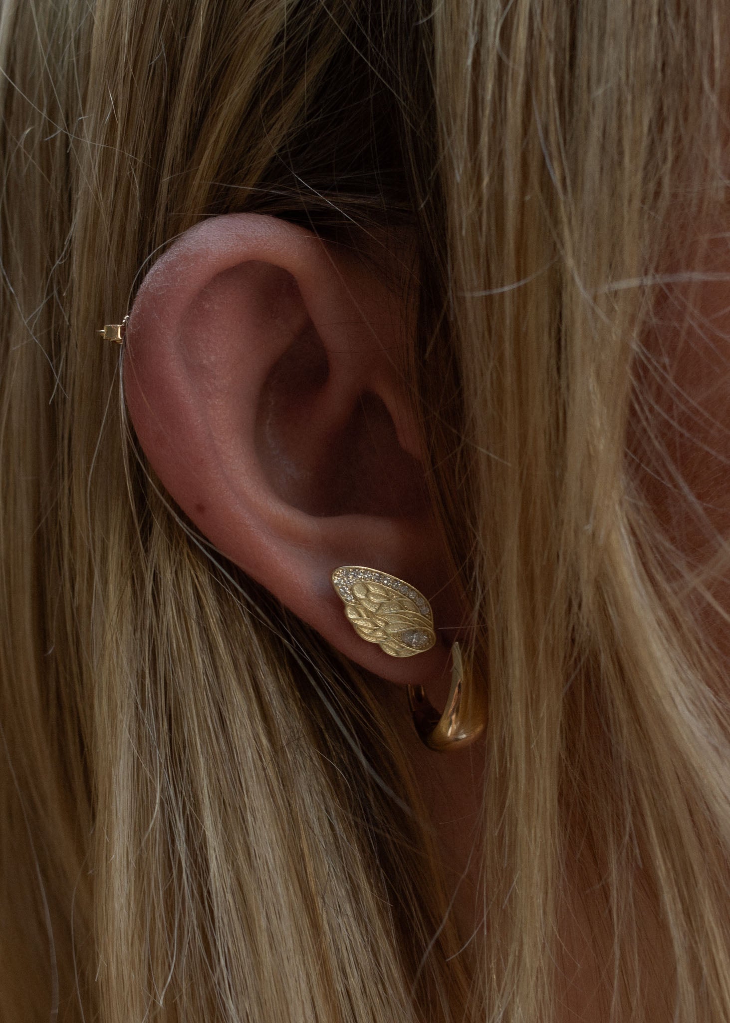 The Cleo Winged Earring is a truly unique modern heirloom, featuring detailed texture, a marquise diamond, and a row of pavé diamonds. Available as a single earring, it pairs beautifully with a bold diamond huggie. Wear one for a statement or both for symmetry.