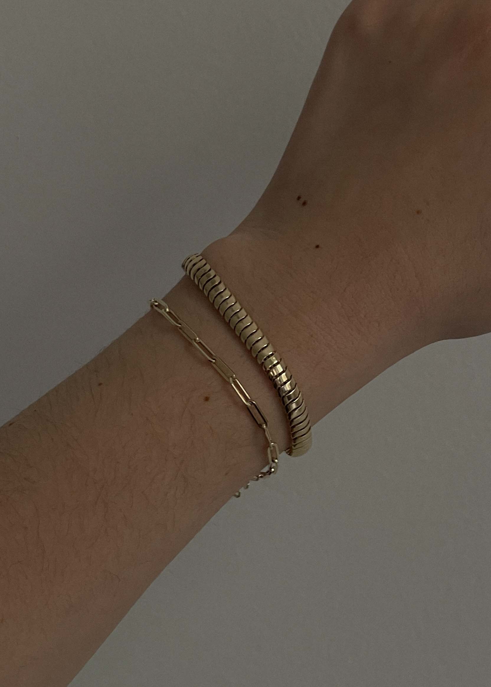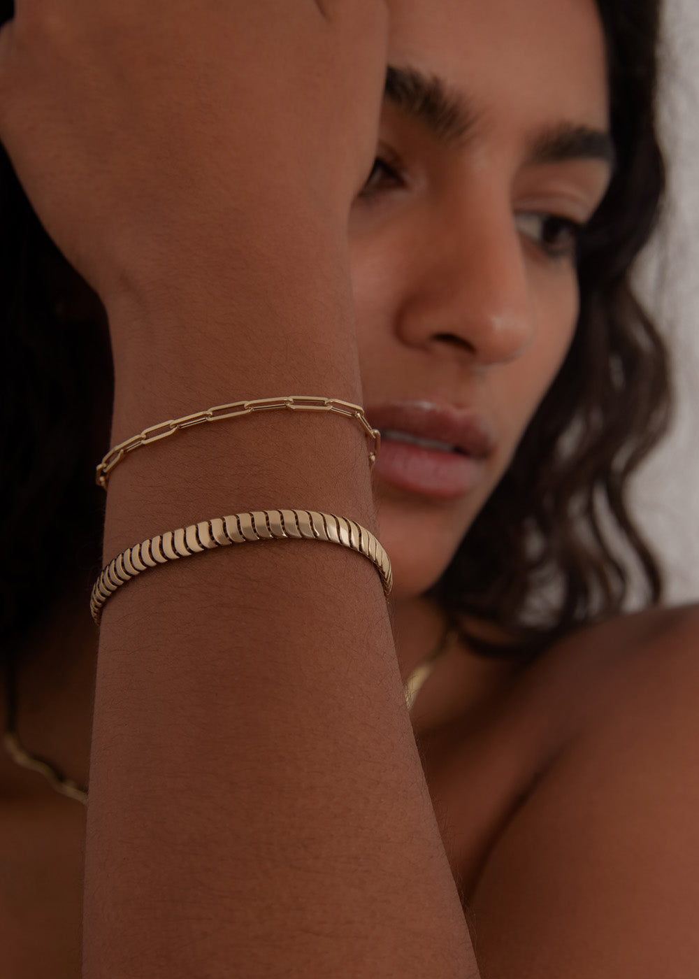 Our Cobra chain links are delicately crafted and hollow. Please handle with care, coiling and securely storing when not in use. For optimal longevity, it’s recommended to remove the bracelet during strenuous activities, as dented links cannot be repaired.