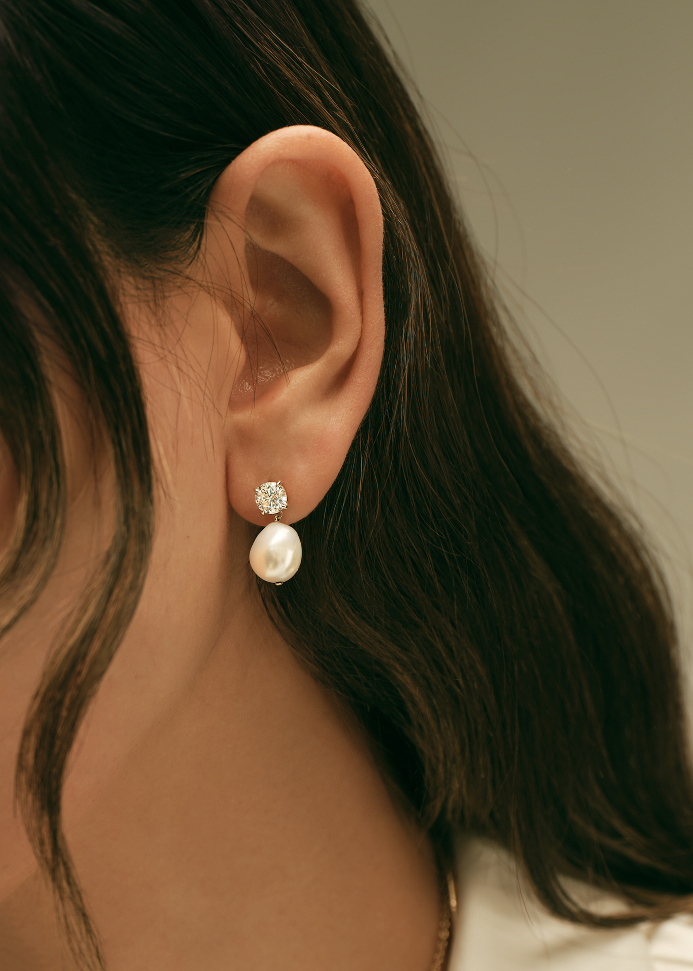 Sculptural elegance, shaped by nature. The Delaine Earrings pair luminous baroque pearls with a delicate stud diamond—distinct, yet effortlessly aligned. No two pearls are the same, echoing the beauty of individuality and the quiet strength of contrast. A modern heirloom designed to bring balance, intention, and light to the everyday. A timeless piece for your bridal story.